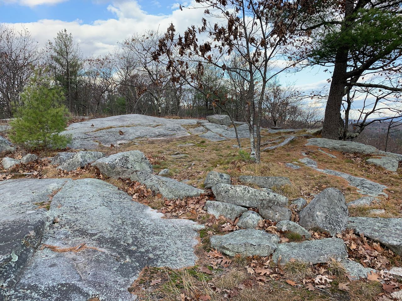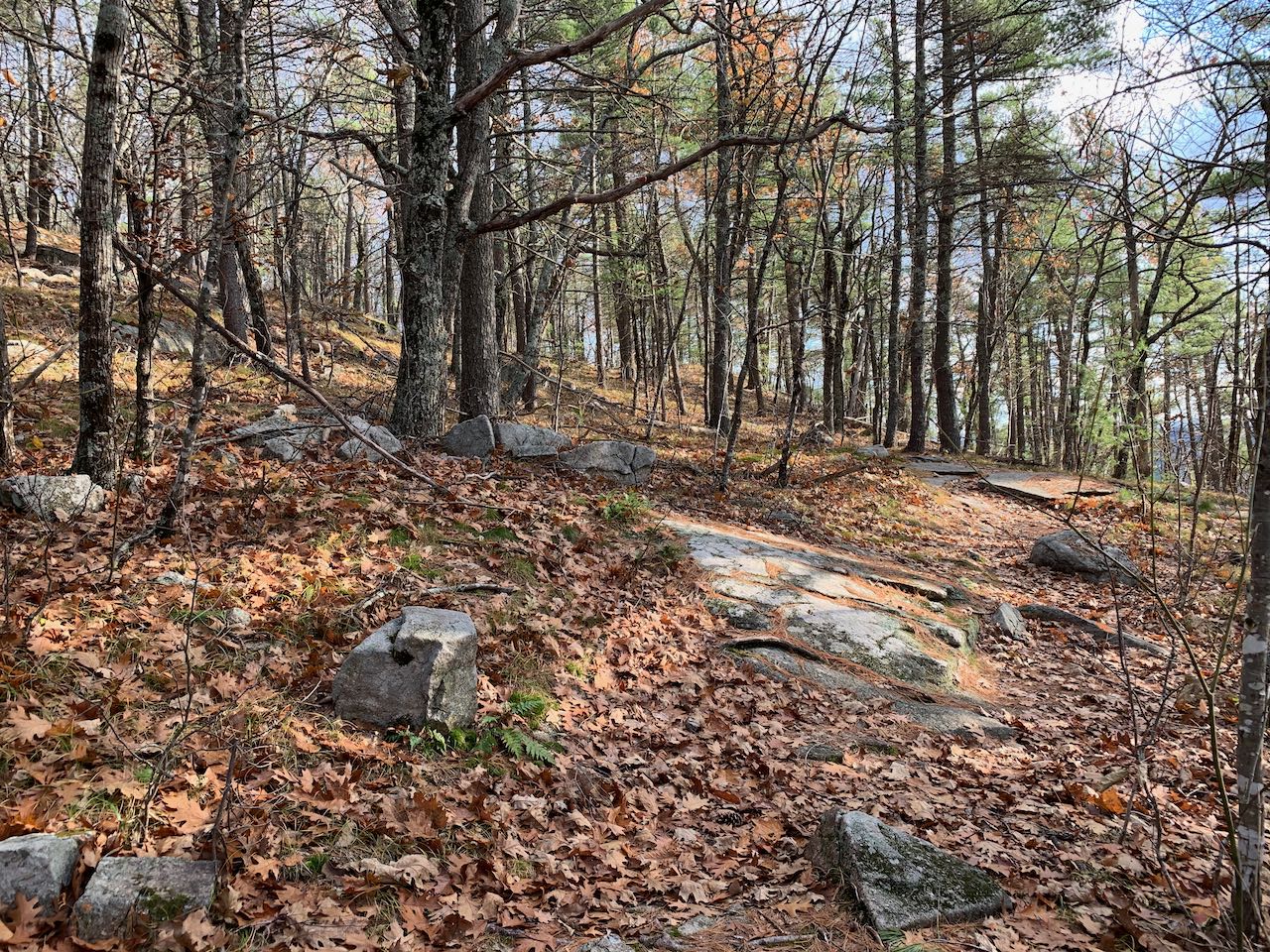 From the sharp curve on Rt. 11 in downtown Alton Bay, just west of the bridge over the outlet of the bay, drive west up Rand Hill Road. In 0.7 miles, take a left onto Alton Mountain Road. In another 1.9 miles, turn left onto Avery Hill Road. Drive 1.7 miles on Avery Hill Road and turn right onto Places Mill Road. In 0.9 miles, turn right onto Griswold Road at signs for the Hidden Valley Scout Camp. 1.1 miles in, stay straight in the middle of three forks as you proceed through the hub of the camp. In the summer months, it may be best to find a place to park before passing through the center and walk the remainder of the raod to the trailhead. Stay on the road to the left of the buildings but to the right of the drive along the lake shore. 0.6 miles from the fork, along a leftward curve in the road, look for a trail sign on the right and park on the roadside on the left. Click here for a Google map.