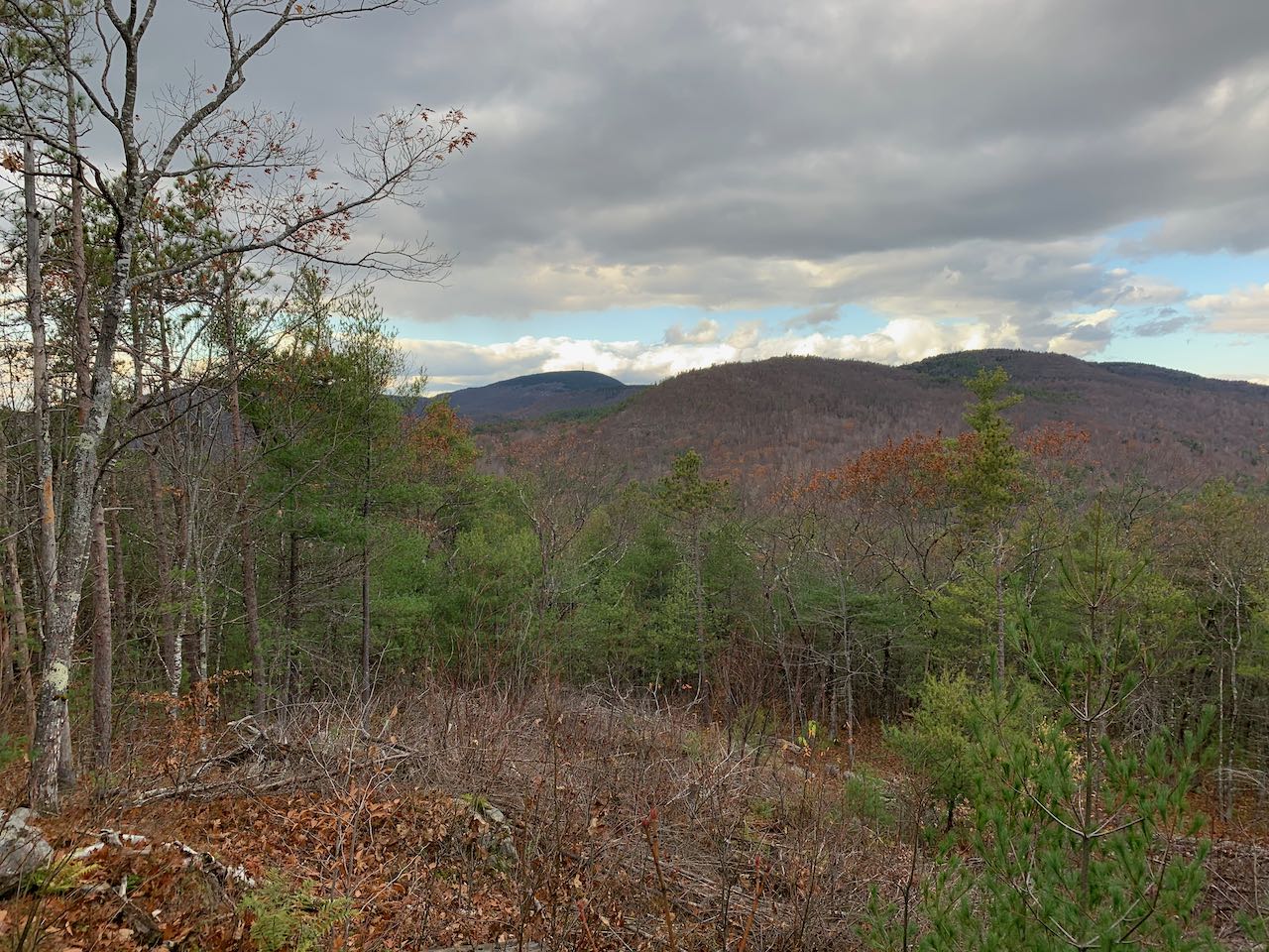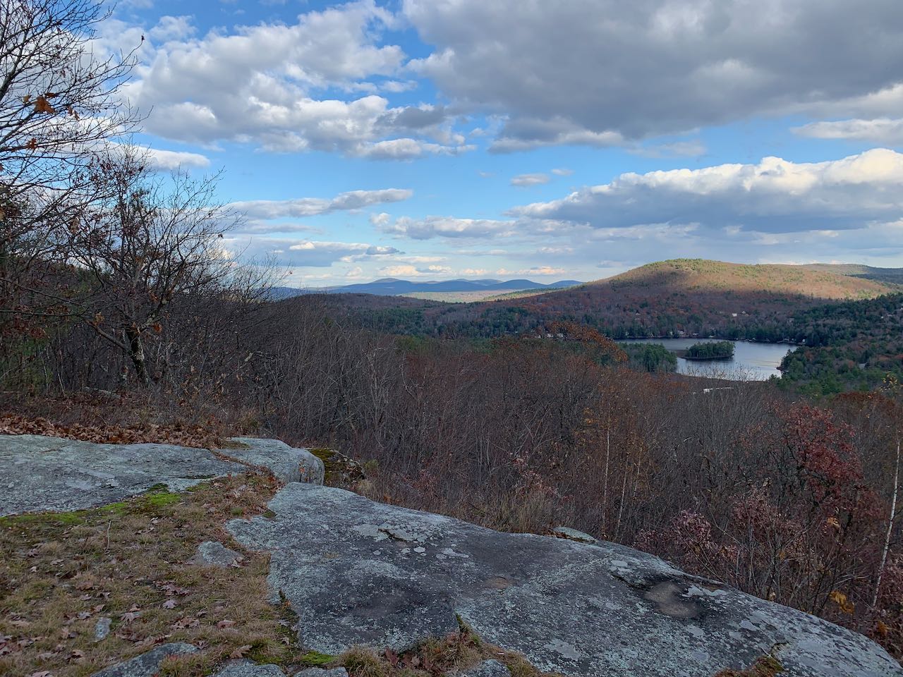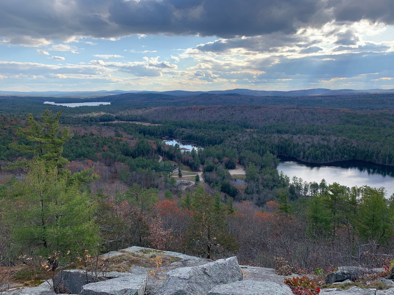 Head into the woods on the right side of the road on the Yellow Trail. Just 250 feet in, fork right as Orange Trail splits off to the left. The trail leads uphill at a brisk pace through a stony gully, surrounded by birch trees. After about 0.1 miles, the trail swings to the right up the rounded top of the hill. The path weaves gently upward through sparse trees growing around shallow ledge patches for a quarter mile to reach the wide, open summit of Mt. Shannon. From the spacious, rocky hilltop, you can enjoy the delightful vista over the lakes and the rolling hills that stretch out behind them. Up close, on the right side, you have Manning Lake and Lake Eileen. Next to Eileen, you look back down on the center of the camp. The larger waterbody out in the distance is Crystal Lake, and behind it in the distance are some of the small mountains in southeastern NH, including the Blue Hills and the Pawtuckaways. Off to the east side of the mountain, you overlook Sunset Lake and Hills Pond, with nearby Avery Hill and Rocky Mountain behind them. All the way to the left, the view extends out to a cluster of peaks around Copple Crown Mountain. If you follow the combined Yellow and Blue Trails (a left from the direction you came up) for just 350 feet, you'll find a cleared-out viewpoint on the other side of the top, facing toward the higher summits of the Belknaps. Mt. Anna is closest, and you can see the towers on Belknap Mountain off to the left.