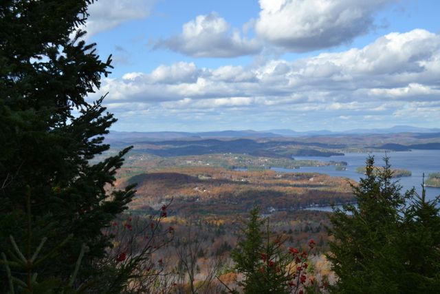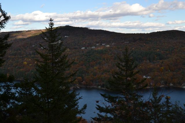 Continuing on, the trail ascends gradually, then swings to the right and heads across the hillside, with rocky cliffs visible through the woods to the left. It reaches a junction with Rim Trail 0.7 miles from the Eagle's Nest spur. Turn left to stay on Newbury Trail and ascend a steep, rocky pitch, reaching the outlook to Lake Sunapee in 0.2 miles.