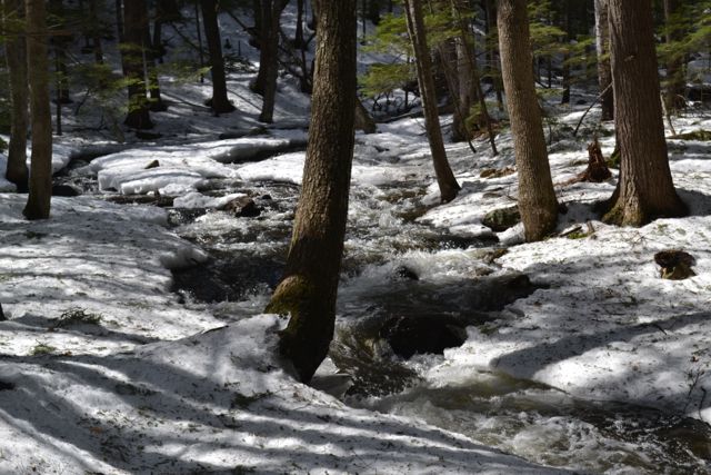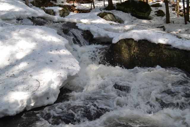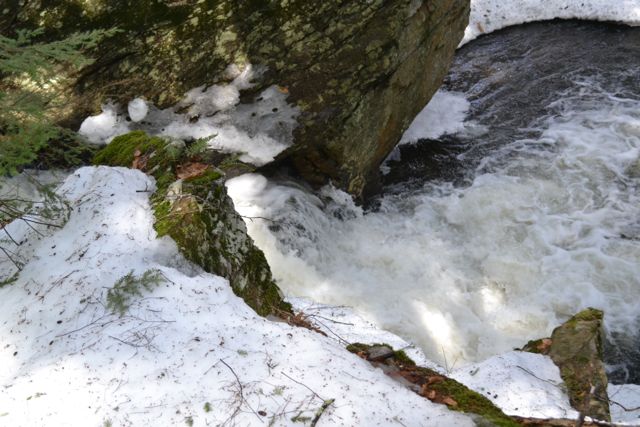 About the Hike: Senter Falls is not really a single waterfall, but a series of cascades on a small brook. It is located in the Alan and Edgar Rice Natural Area, a tiny 16 acre preserve. There is a loop trail through the preserve, which follows Cold Brook past the Senter Falls cascades. The trail begins across the street from the pull-off at a trail register. The trail descends through an open forest, following plastic yellow trail markings. Soon, the trail leads over the south branch of Cold Brook on a small wooden bridge. Here, the trail splits into a loop. Bear right to complete the loop in the recommended direction. As you walk through the forest, you will hear the rushing of the brook.