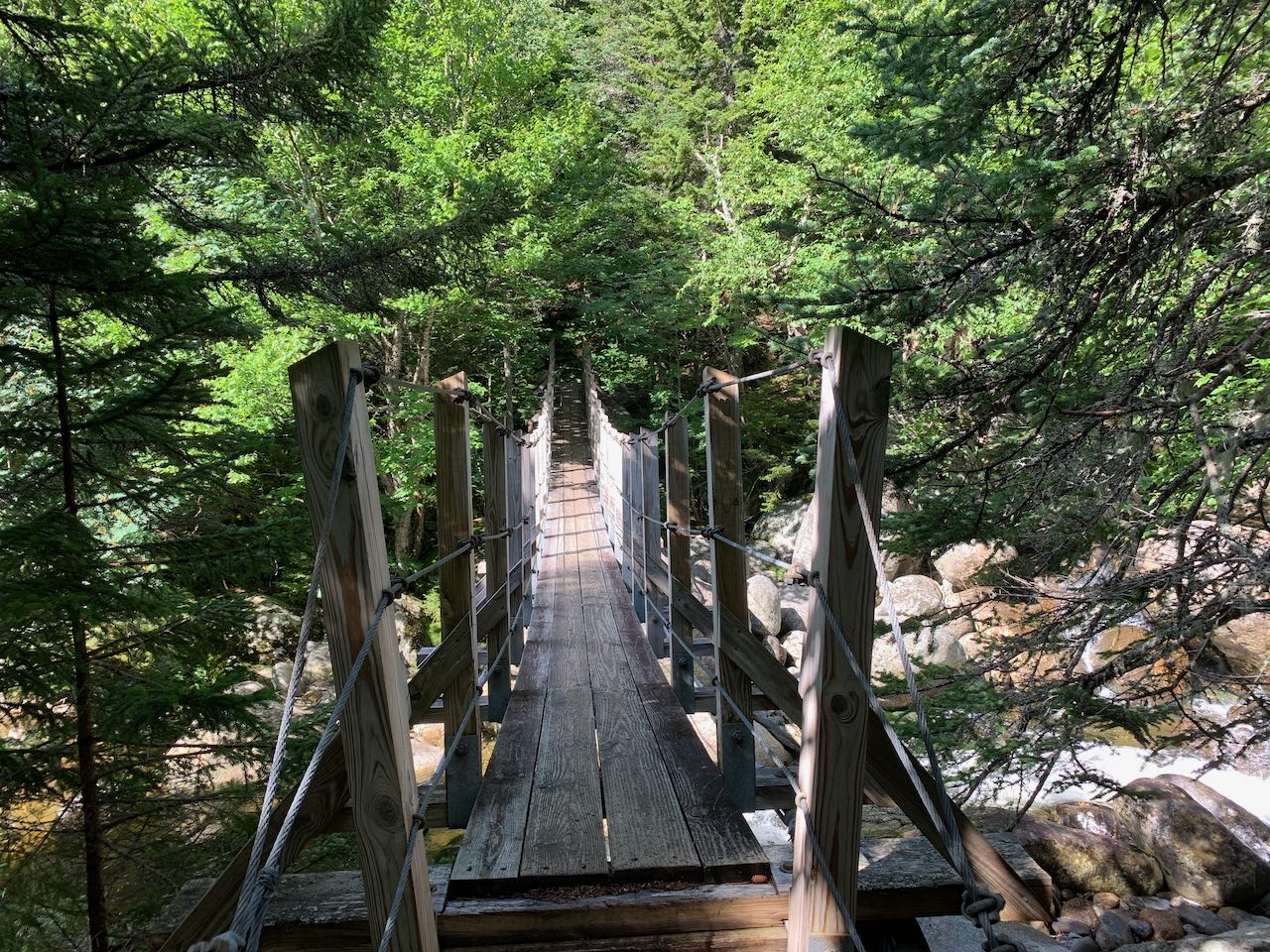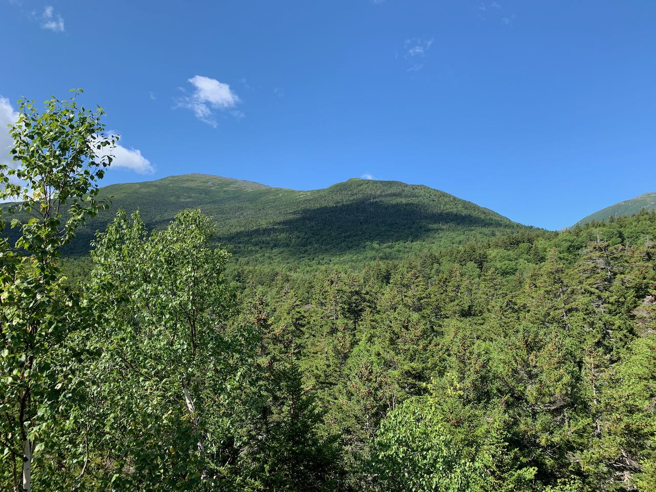 From the information kiosk at the lower end of the parking area, walk down the paved path along the river to the suspension bridge. Cross the bridge and get your first look at the rocky river that will be your on-and-off guide through out the hike. Drop down the stairs off the bridge and climb uphill for a bit to reach a junction with Great Gulf Link at 0.3 miles from the start. Bear left and walk along a smooth surface with just a few roots underfoot from the dark hemlocks surrounding the trail. In this section, the trail doubles as a cross-country ski route. The river remains close by on the left. In another 0.3 miles, bear left as the trail detours around a muddy section of the ski trail. The path narrows and runs rough just atop the riverbank, with rapids and little cascades below, crossing one little stream. It then begins to pull away from the river. Passing by a swampy depression, it runs straight through a hobblebush corridor to rejoin the ski trail after 0.4 miles. The trail ascends gently, crossing a couple streams on wide wooden bridges built for skis (these can be slippery in the summer). In 0.6 miles, the trail passes a ski trail junction and immediately after crosses the boundary line into the Great Gulf Wilderness, marked by a sign. With a rockier surface on the trail, continue 0.2 miles, passing a large boulder, to the next trail junction, where the Osgood Trail takes off to the right. The trail now begins to approach the river again, climbing through mossy rocks along the base of an increasingly steep hill. 0.6 miles past the junction, the trail comes out to an opening right beside the water, where you have the opportunity to explore around the boulders in the river. Just beyond this, the trail climbs a steeper pitch up the bank away from the river. At the top of a rock staircase, it moderates and continues climbing with a couple flat sections to emerge in the gravelly clearing at the top of The Bluff, 0.3 miles from the river. You'll get a glimpse of the high mountaintops as you approach the top. Where several campsites exist across a grassy clearing, scramble up to the top of a boulder on the right side of the trail to see the best view. Over the trail to the left, you can just see the top of the Wildcat Mountain Ski Area. Across the valley from you rises the form of Chandler Ridge, which carries the Mt. Washington Auto Road. Off on the right side, you can see where the interior of the Great Gulf wraps around the corner, although you can't see into the valley floor. Mt. Jefferson overlooks this portion of the gulf, while the triangular summit of Mt. Adams is closer on the right side of the view.