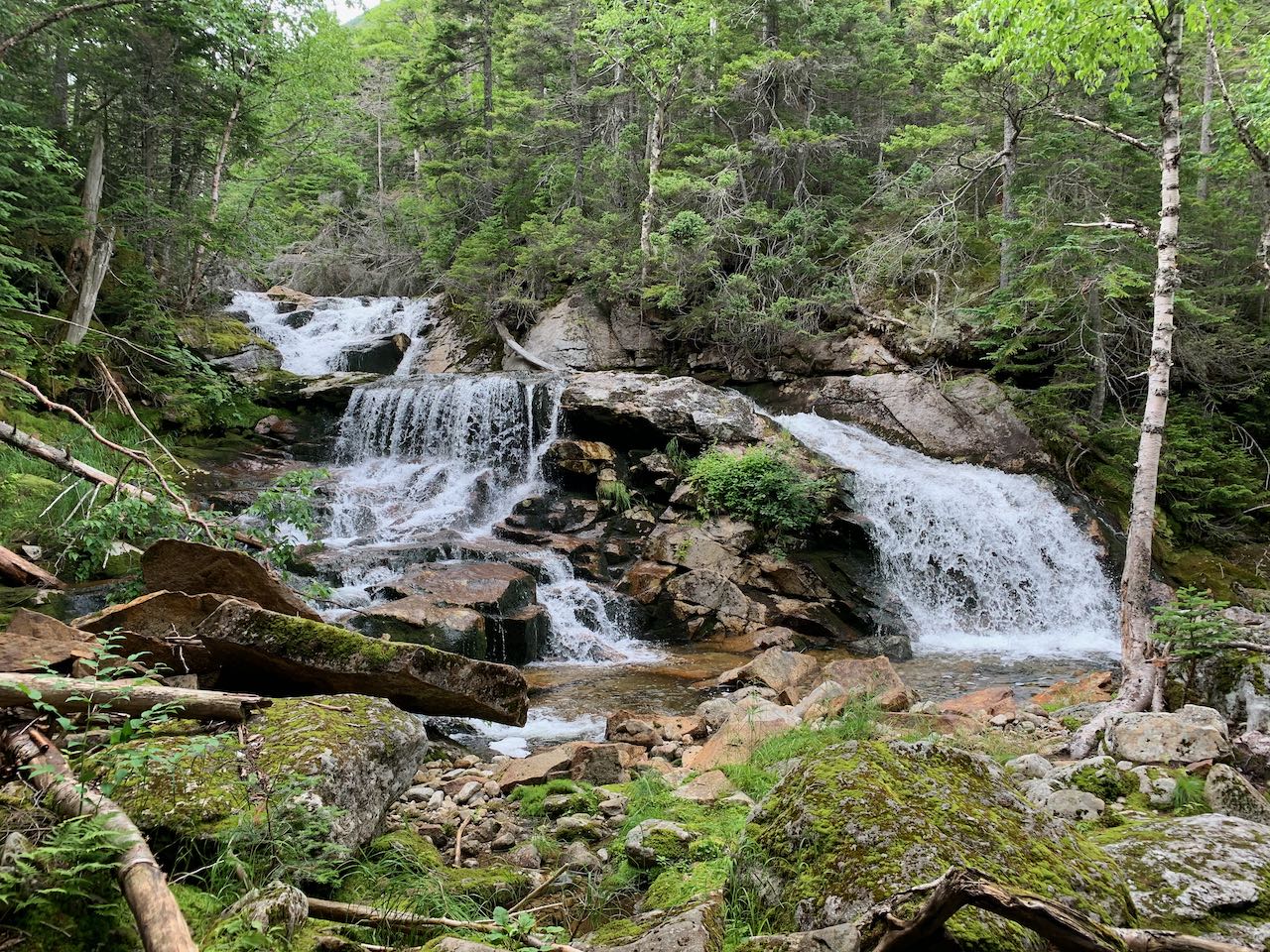The trail enters a dense forest with intermittent breaks in the trees where the craggy mountainsides all around become visible. It passes a campsite clearing, and after 0.3 miles crosses a small brook. It remains close to the West Branch, dwindling in size now that you're further upstream, for another 0.3 miles. After crossing another smaller brook, it climbs a particularly rocky pitch through boulders, passing a small cascade, and comes out onto the edge of an often-slippery ledge slab. The most difficult section of the trail in the floor of the gulf commences, as you must climb steeply up the ledges alongside the river. Stay close to the trees and use them for support, as the footing is uncertain on the mossy and damp rock. You'll soon come out onto the most open ledges, where the reward for your effort is an incredible, long cascade chain with a view out to the mountains. Enjoy the scenery as the water crashes through boulders above and snakes down over the uneven ledge surface. The top of the ledges is an excellent spot to take a break and enjoy the view. From here you can see both of the Jefferson's Knees and Mt. Adams. The direction from which you view the mountains gives an indication of how far you've hiked into the gulf.