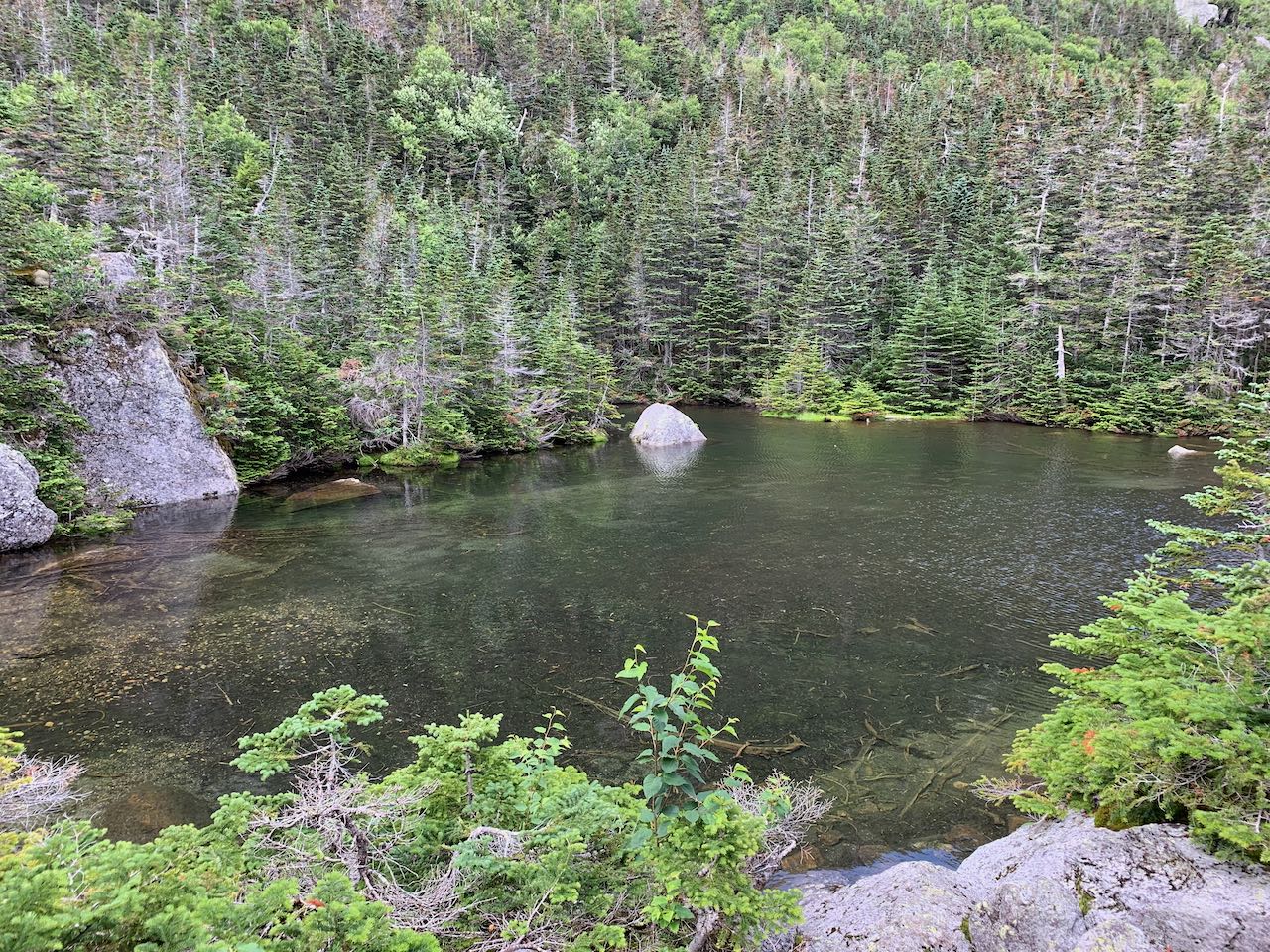 The trail continues up along the edge of the ledges beside the wild river, passing another sizeable cascade before ducking back into the woods after 0.3 miles mostly out in the open. It crosses an unnamed brook flowing down from Chandler Ridge, then passes by what could be the most beautiful waterfall in the gulf, where the river cascades down past a ledge wall and splits into two wide, side-by-side plunges that fan out majestically for your viewing pleasure. After 0.2 miles between crossings, the trail crosses the west branch on small rocks. Though now small enough to be passable on foot, this crossing can be difficult and unsteady. Now weaving through an area with a deep-woods aura, the trail crosses a brook of similar size that flows down from Sphinx Col and quickly reaches a junction with Sphinx Trail after another 0.1 miles. Bear left. Just as the river is dwindling in size as you travel upstream, so the Great Gulf Trail becomes wilder and less used with each trail junction you pass. From this point on, no other trails diverge until the Great Gulf Trail reaches the summit of Mt. Washington. Just past the junction, cross the West Branch back to the other side. Again, use caution here as the small stones to step on can be slippery and unsteady. In 0.1 miles you'll reach Weetamoo Cascade, a majestic waterfall that spreads out over a blocky ledge and flows into an emerald-tinged pool. In another 0.1 miles the trail crosses a smaller brook. Weaving through yet more lush and mossy areas scattered with boulders, the trail approaches a region where blowdowns are frequent all through the forest. It crosses another litle brook after 0.3 miles and soon climbs into a more open blowdown patch where you'll start to see the gulf walls encircling you. In another 0.3 miles, the next brook is crossed, and the trail climbs a final 0.1 miles to an opening at the north end of Spaulding Lake, where the forest opens up and you can take in the breathtakingly rugged landscape surrounding the tiny pond. All the water draining down thhrough the ravines collects into this tranquil pool and forms the headwaters of the river. It is an awe-inspiring sight with the broken cliffs and talus slopes rising well over a thousand feet on three sides. Spaulding Lake is only 200 feet in length, so walk over to the other side and find the best spot to enjoy the view. Your trip ends here, unless you have the ambition to tackle the arduous slog up the headwall to the top of Mt. Washington - one of the most challenging ways to summit New Hampshire's highest, but one that rewards with scenery like no other.