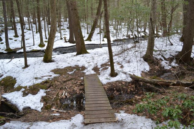 About the Hike: Located inside Tucker Brook Town Forest, Tucker Brook Falls is a small and hugely seasonal waterfall. If you visit in spring, you will be treated to a wide, rushing cascade, but if you go in the summer, you'll see nothing but a trickle over a wet rock! To visit the falls, you can follow a short trail and an optional scenic loop that leads along the brook. Facing the back of the parking area, the trail begins on the far right, next to the road. Follow this trail, the Ridge Trail. The trail from the parking area parallels the road not more than ten feet away. It slowly turns away in the direction of Tucker Brook. After crossing a bridge and ascending a small hill, you will arrive at the fork at the beginning of Falls Loop, after about 0.3 miles. Turn left and follow this trail to take the loop, or continue on and take the next left for the more direct route.