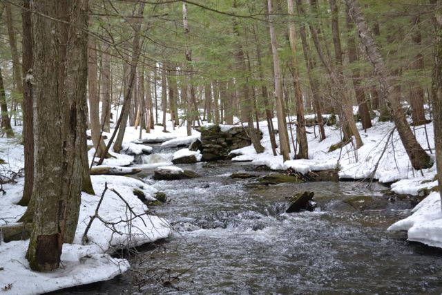 The falls are very close to here, but to approach them from the loop, you will travel downstream (at the far end of the falls loop, there is another trail going out to a different parking area; turn right to stay on the trail), then follow the brook back toward the falls. On the way, you'll pass the remains of some old stone dams by the water. When you reach Tucker Brook Falls, you will be able to walk down by the river in front of it to get a good perspective. It is a short waterfall, wider than it is tall, with water flowing smoothly over the drop so that no rock is visible behind the water. When you're finished admiring the falls, you can walk to the top and see it from there. Soon after leaving the falls, you will be back at the beginning of the loop. Turn right and you will quickly pass where you first turned onto the loop.