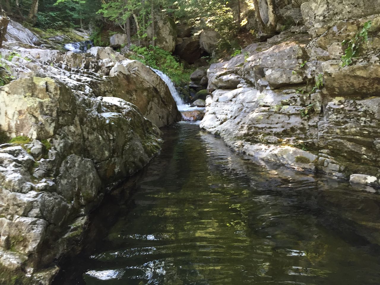 Starting at the pull-off, follow the Winniweta Falls Trail through a clearing and down to the bank of the Ellis River. Wade across, using caution on the round stones and pebbles under the current. On the other side, the narrow pathway heads through another brushy clearing. Stay straight through the intersection with two ski trails, and at 0.3 miles beyond the river, bear left and join one of the ski trails. At this location on the way back, you'll notice a 'do not enter' sign facing the other way. The trail remains level for another 0.1 miles, then approaches Miles Brook briefly before swinging uphill. The trail climbs moderately across the hillside, crossing a minor drainage, climbing some more, and contouring back over to the brook after 0.35 miles. Look on the left side of the trail for an unmarked path leading out to the brook. This will put you right in the middle of the cascades that make up Winniweta Falls. From here you have a cool view over the stream as it churns around it in a deep pothole and cascades down weathered ledge to end at a two-tiered pool at the base. It takes some effort to get down to the base, but if you can find your way around through the woods, you have a nice view looking up at the multi-tiered cascade from the pool. Just above the top of this fall, beyond a bouldery stretch of the brook, is a small gorge formation with a little cascade into it. Upstream from this is another smaller waterfall of similar character to the lowest one but of smaller magnitude. Cascades continue up beyond this, and further exploration can be rewarding. The cross country ski trail continues uphill and parallels the brook past where the official hiking route ends.