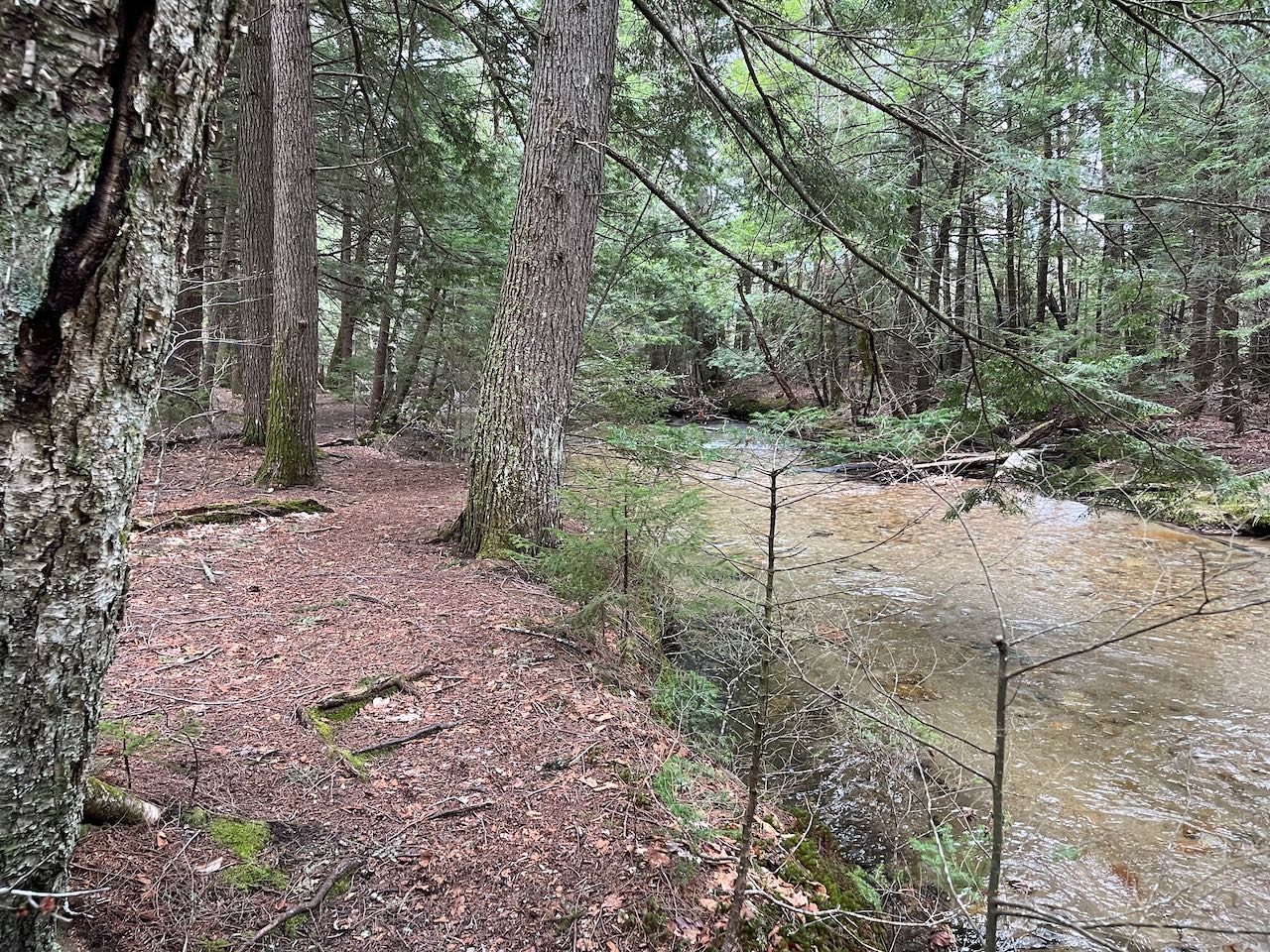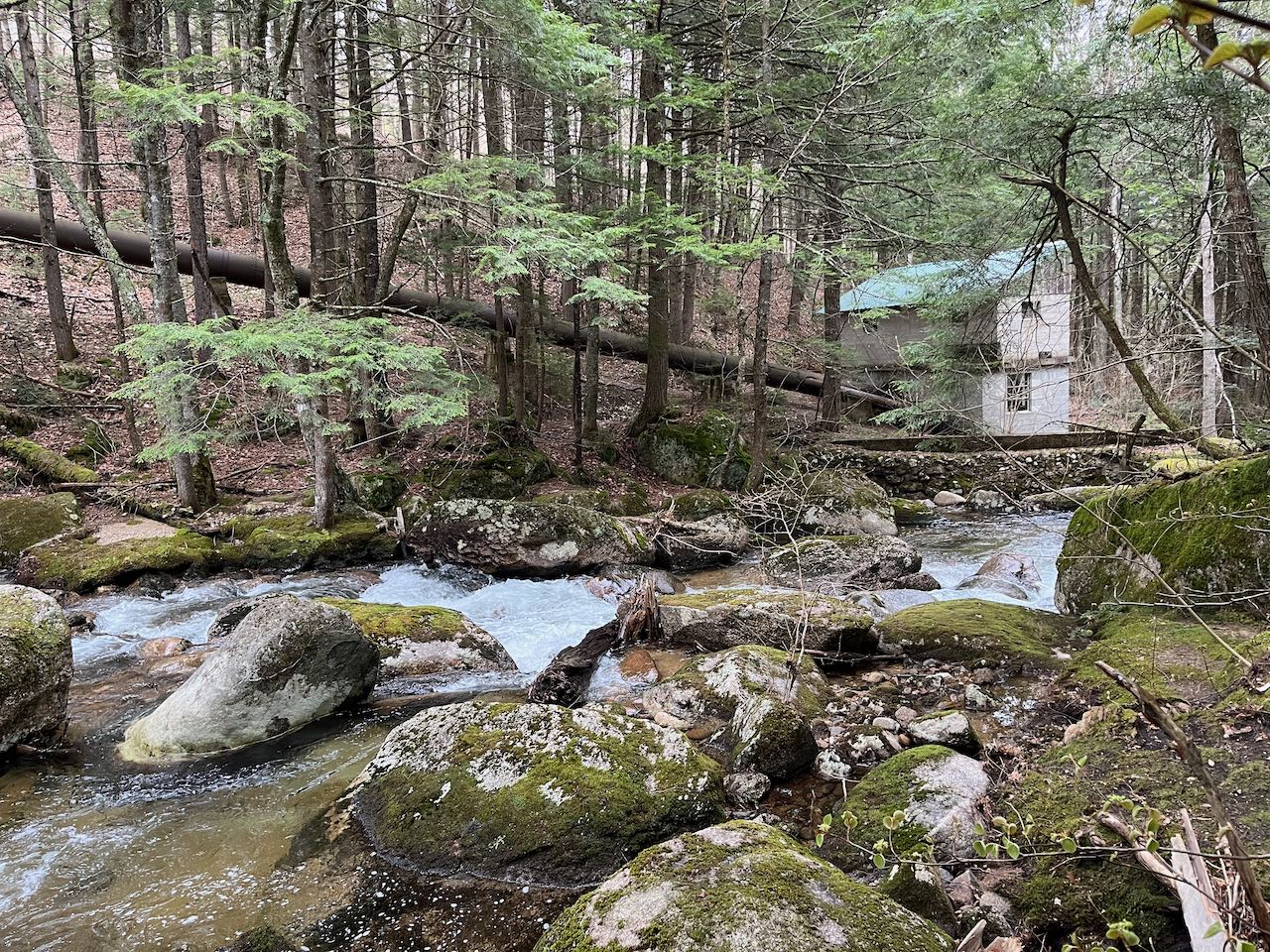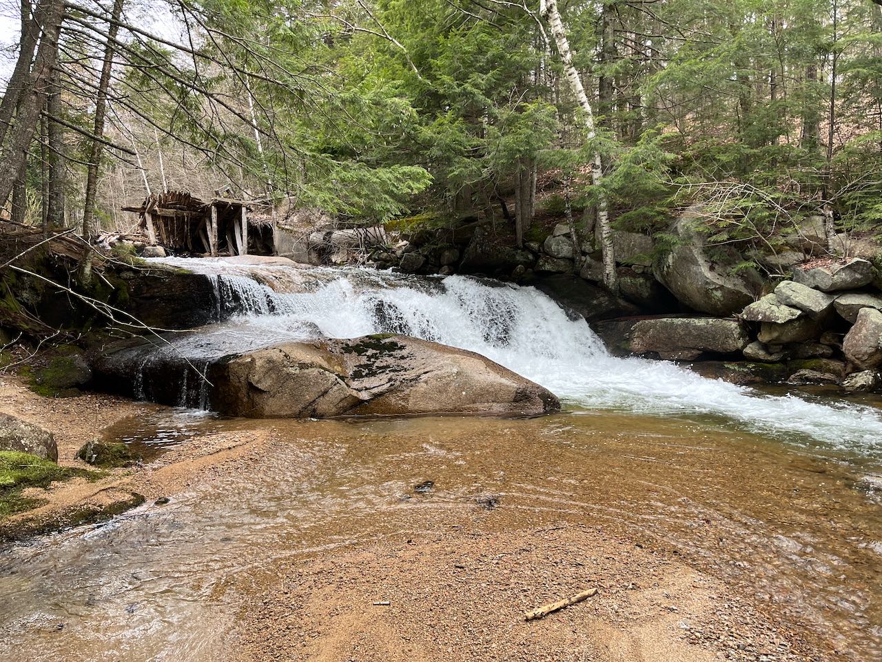 The trail heads out into the verdant forest, winding alongside the Wonalancet River, which has just crossed under the main road. It follows closely along the bank of the shallow, gravelly waterway, as a tributary begins to approach from the left side of the trail. It crosses the tributary on a wooden bridge after 0.15 miles and leads past the confluence, where large gravel deposits abound. It stays close beside the river underneath a tall hemlock canopy and crosses another stream on a wooden bridge after another 0.25 miles. After 0.2 miles, it passes by an area of small cascades through huge boulders in the river. It continues down through the sharp valley, passing by one large boulder in the trail, and crosses the river on a bridge in 0.2 miles. The trail climbs up the other side and intersects a snowmobile trail, follows it to a turn, and turns left, descending back toward the river. After 0.2 miles, the trail reaches the remains of the old mill on the river, where the the water breaks through the dam wall and begins a series of cascades over a ledgy brook bed. An old pipeline can be seen on the other side alongside a stone wall. The first significant cascade is just downstream of the dam, just a few feet tall but quite powerful in the early season. The river continues into more cascades further down as it plunges through a slot in the ledge and foams and bubbles. The trail passes around a high rock wall and the main falls come into view. Two side-by-side falls pour over the ledge, with the closer and smaller one coming from beneath a rock. The larger side thunders down, spreading out as it drops. Just further down from the falls, you'll find the pipeline connecting to an abandoned mill building across the river. The trail beyond here connects back to Rt. 113A further east. This portion is less travelled than the way you came.