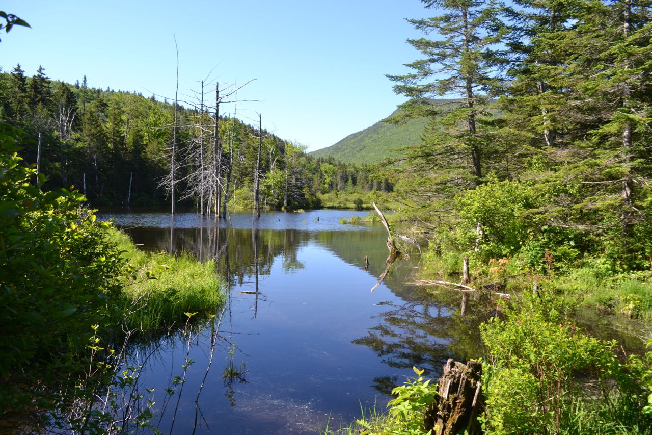 The gravelly path soon comes out into an open area, 0.2 miles from the first bridge, as the river finds its beginning in a long chain of wetlands leading up to the height of Zealand Notch. It follows a narrow elevated path through the bushes, where wildflowers abound, before crossing the open water on a long boardwalk. Take your time as you cross this bridge, as you'll enjoy views over the marsh of the steep wall of Zeacliff not too far away. On the other side, the trail turns toward the water and follows it closely, with a few more mountain views. The trail then heads on a long straightaway just off the side of the marsh, with one minor crossing of a gravelly brook in the middle. At the far end of the marshes, step just off the trail at break in the trees for a view of Mt. Tom over the grassy open water. 0.6 miles from the first bridge, head straight through the junction with A-Z Trail. Just beyond, the trail crosses the Zealand River one last time at its very headwaters in the marsh, with views of Zeacliff Pond Peak to the right. It crosses the unnoticeable highest point in Zealand Notch, where it comes up to the side of Zealand Pond. Now on the other side of the notch, the water from this pond drains into a different watershed, following Whitewall Brook and not the Zealand River. About halfway through, a spur path leads to the edge of the pond, where you can look over the clean open water toward the hillside on the lower part of the Zealand-Hale ridge. Look closely in the trees and you can see the cascades above Zealand Falls. The trail leaves the pond, and in 0.2 miles from the bridge, arrives at the trail junction with Twinway.