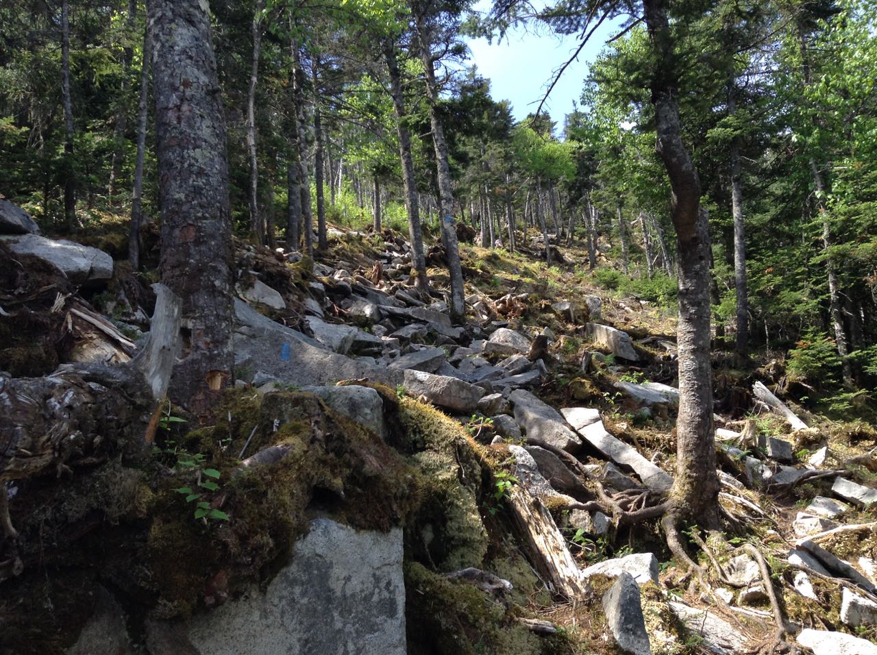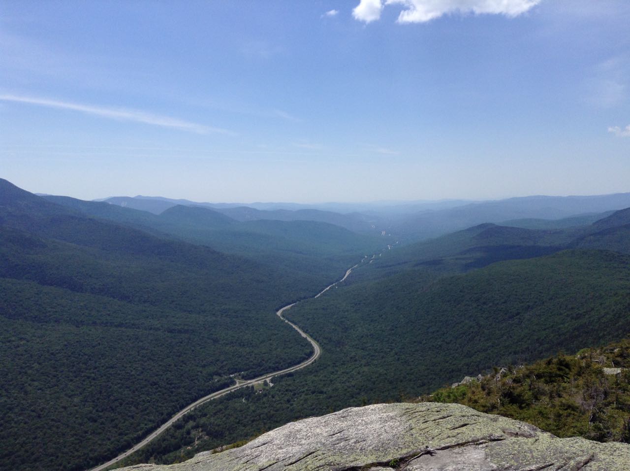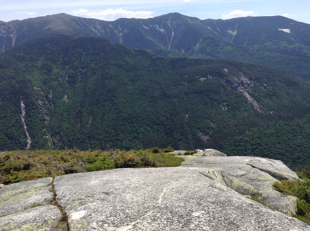 From the parking area, follow the signs for Kinsman Ridge Trail down a dirt road on the far left. In a short distance, turn right and walk along the left side of a huge gravel pile, then turn left into the forest at the sign marking one end of the Kinsman Ridge Trail. The trail quickly begins climbing. After the first few steep pitches, the trail swings to the right and angles up the slope, still climbing steeply. It soon begins switchbacks, and not too far into them becomes horribly eroded. Climbing is tedious on the loose gravel path as it winds through the worn-down gully. In 0.9 miles from the parking area, the trail crosses a ski trail known as Kinsman Glade, where the trail becomes very rocky. Switchbacks continue through the glade, and the trail crosses it three more times. Each time, the view through the trees improves. At the best viewpoint, you can look north across Echo Lake and Bald Mountain to the distant Great North Woods as well as across the notch to Eagle Cliff. After the last crossing, the trail climbs over extremely rocky terrain along the left side of the glade. After 0.4 miles in Kinsman Glade, the trail turns left and climbs more gradually for 0.3 miles to a rocky area. Here, turn left onto a spur trail and walk out to a magnificent ledge viewpoint above the Cannon Cliffs, where there are wide views across the notch to the Franconia Range and south over the flat lands along Rt. 93. You can also look up to Cannon's summit.