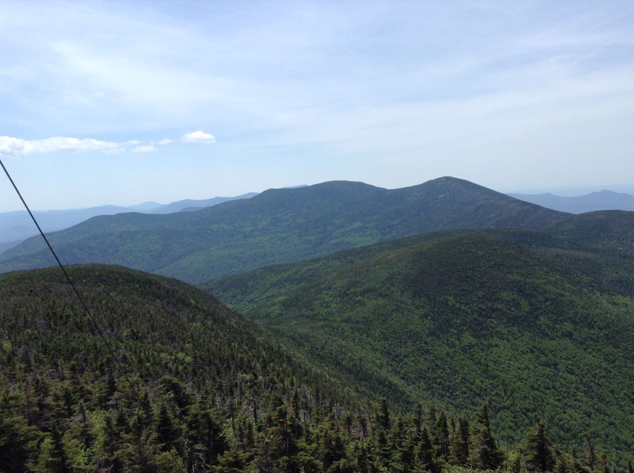 The main trail climbs briefly over the East Peak of Cannon Mountain, the descends just as quickly to an area which can be muddy. The trail is fairly flat for a while, then it climbs onto open ledges, where you can see back to East Peak. The trail now stays in the open, climbing through a small talus slope with great views before going back into the forest. In 0.5 miles from the viewpoint spur, turn left onto the combined Kinsman Ridge Trail/Rim Trail, one of Cannon's gravel tourist paths. This trail leads across the slope, passing several viewpoints before swinging around to the right to head toward the summit. At this turn, Kinsman Ridge Trail turns left and leaves the tourist path. Turn right to stay on Rim Trail and quickly reach the summit. At the top of the observation tower, there are views in all directions. Now you can see over the Cannon Balls to the higher summits of North and South Kinsman. To the west, the view takes in distant Vermont. New Hampshire's Benton Range peeks out from the side of North Kinsman. To the north, the view extends far into the Great North Woods, seen over the tramway summit station and Mittersill Peak. To the east, you can look back over East Peak to the view you saw earlier. After enjoying the view, descend the tower to the lowest landing on the staircase and turn left onto Short Path. This brings you to the tramway summit station, where you can purchase food at the summit restaurant. Since hiking is not allowed on the ski trails, follow Rim Trail back to the first junction with the Kinsman Ridge Trail and turn left into the woods. Note that if you would like to visit the restaurant before the summit tower, you can, obviously, hike the short loop in the opposite direction it was described in.
