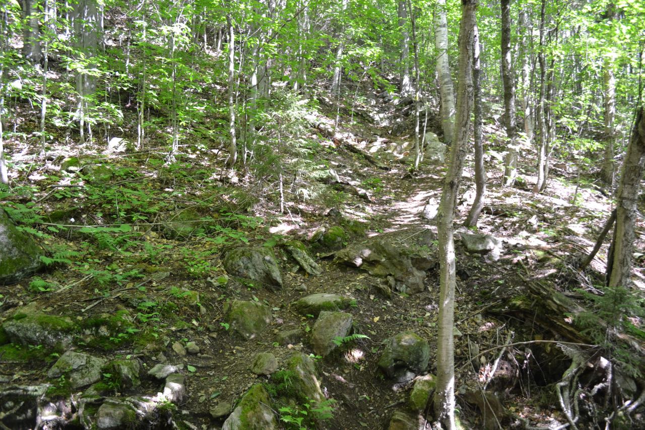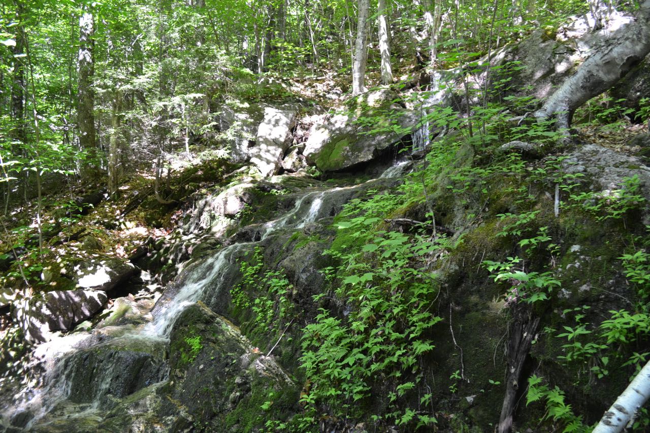 The trail begins at the highpoint of Evans Notch, the least developed major-road-acessible mountain pass in the White Mountains. The trail sets off into the forest, crossing a minor stream named Evans Brook and immediately ramps up the steep wall leading out of the notch. 0.1 miles in, as the trail swings to the left to angle across the slope, it crosses a different tiny brook at a ledgy area above a fine cascade (this minuscule waterway will eventually become the Cold River). There is not a good view of the waterfall from here, but it is worth the slight effort to walk down off the trail to the base of the tumbling cascade.