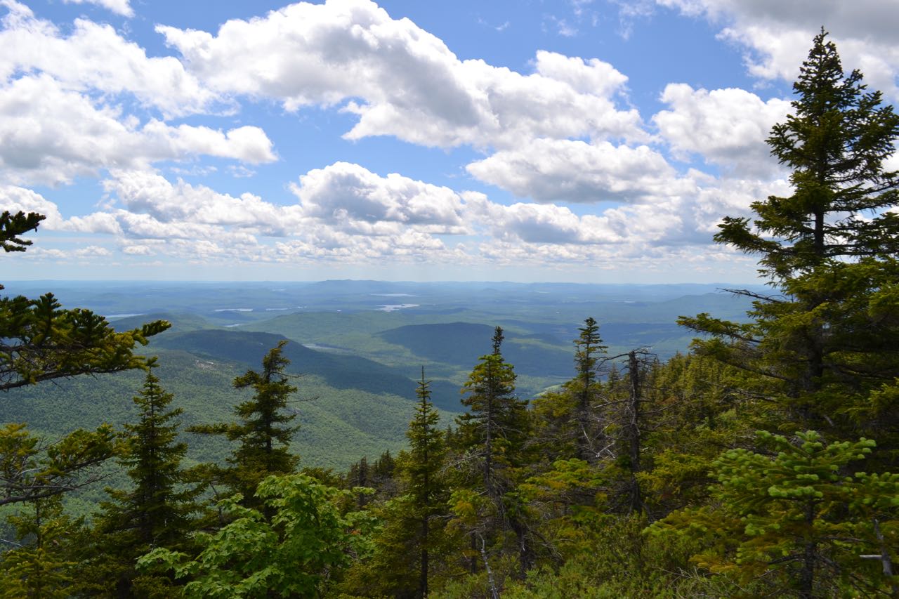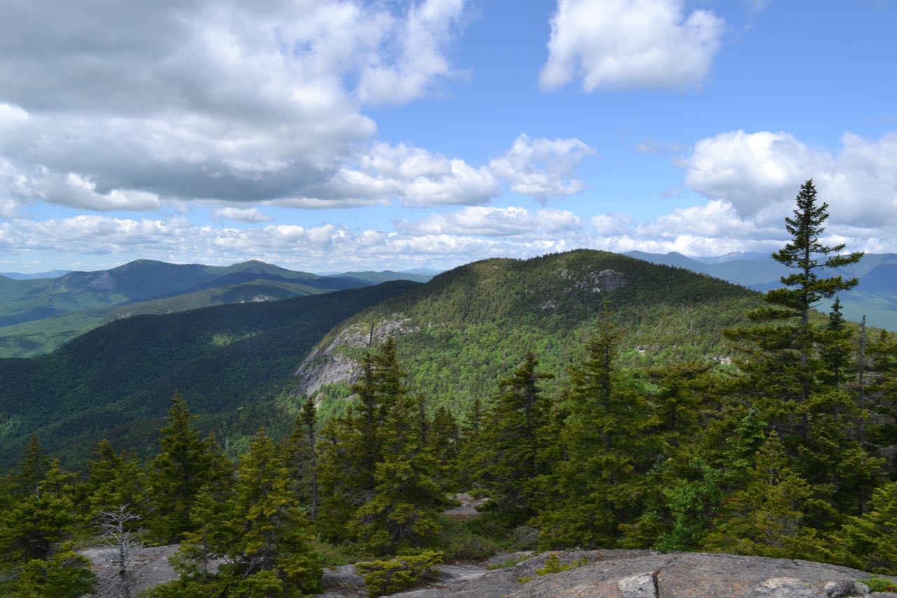 From here, the trail begins its ascent of a northeast ridge which protrudes from the mountain's southern shoulder; it approaches from along the brook for the next 0.4 miles, crossing many seasonal streams, then swings into its first switchback to attain the crest of the ridge. The trail's upper section comes fairly close (not within sight) of the incredibly steep slope plummeting down into the drainage south of the Evans Notch highpoint, which you drove across from if you came from the south. Closer to the top, it becomes steeper and switchbacks through darker, coniferous woods. After another half mile of relentless climbing, the trail begins to level out and reaches a junction with Royce Connector. This trail is used to access the Royce Trail; you will use it after visiting East Royce. To continue to East Royce, turn right to stay on East Royce Trail and quickly resume the rugged ascent over roots and rocks. This is the steepest part of the ascent. After 0.3 miles and several tricky rock scrambles, the trail climbs up a sloping ledge with the first view. This ledge views east to Speckled Mountain in the Caribou-Speckled Mountain Wilderness. Continue climbing alongside and over more ledges for 0.2 miles to a large open area marked by a trail sign. Here, just across the plateau from the true summit, you will find a wild, rugged vista. The flat expanse, spotted with lakes, sprawls endlessly to the east beyond Speckled Mountain. To the south, you gaze down the impressive Baldface Range, starting with West Royce and its striking cliff face. The Baldface Range rolls down to the west into the extensive Wild River valley, mostly hidden by the peaks. The massive Carter Range rises across in the distance.