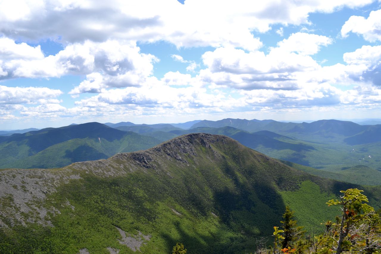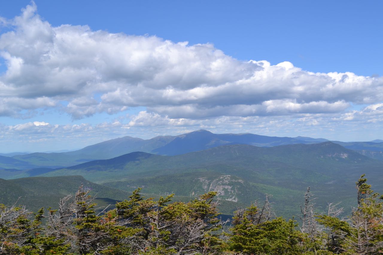 From the sunny ledges, you have a sweeping vista over the eastern Pemigewasset Wilderness. Directly below you is Zealand Notch and the talus on the side of Whitewall Mountain. Above is the Willey Range, with the Presidential Range behind. To the right of the Willey Range is the southern Montalban Ridge. Rising from the vast valley is low Shoal Pond Ridge, with Shoal Pond at its northeast end. Across the valley is the Nancy Range, separated from massive Mt. Carrigain by deep Carrigain Notch. To the far right is Mt. Hancock. By walking down to a lower ledge, you can glimpse Mt. Bond.