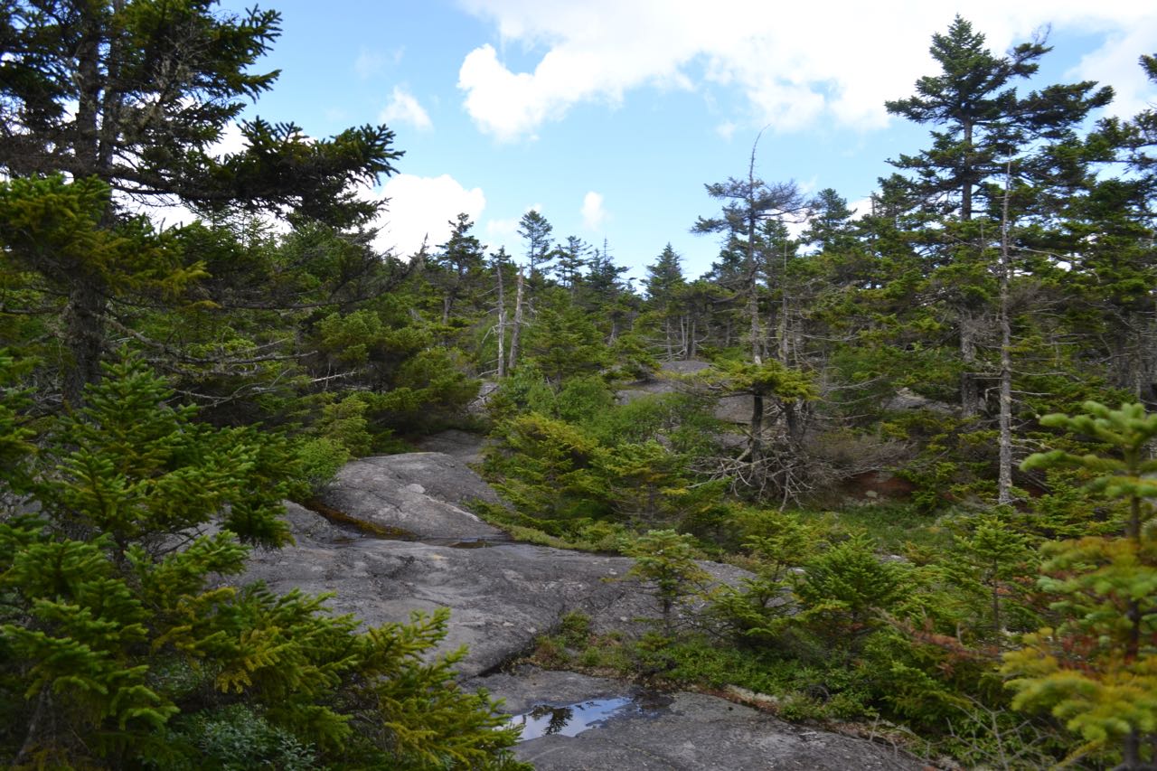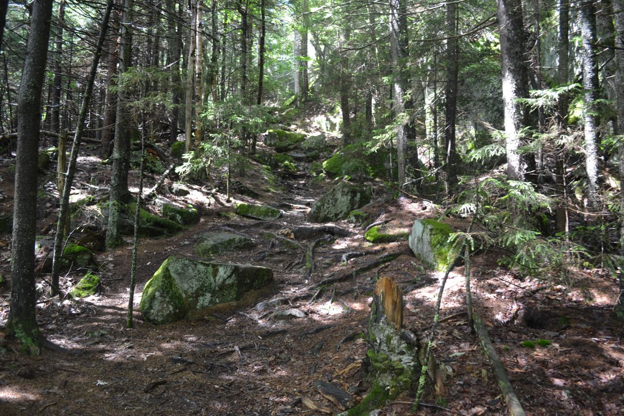 From the parking area at Mead Base, walk to the kiosk and follow the path past the side of the farmhouse to a sign for Wentworth Trail, where the trail enters the forest and begins a moderate ascent through bright hardwoods. In 0.3 miles, the trail hops a stone wall and shoots across the slope, crossing several seasonal streams for a tenth of a mile before crossing a larger stream and turning uphill to follow it past burbling little cascades. The trail diverges from the stream after a quarter mile and continues angling uphill for another quarter mile over stony ground. After a sharp left turn, the trail steepens and switchbacks become more frequent over rockier terrain. The trail continues this way for about 0.4 miles before it passes beside a rock wall and climbs up to reach the first viewpoint, where there are good views over the trees to the Lakes Region. From here, the trail climbs a very steep and rocky pitch, then levels off as it crests the broad plateau atop Mt. Israel. After a long section of easy walking though dark conifers, the trail emerges on open ledges with restricted views a quarter mile from the first viewpoint. It then continues over the ledges for an equally long section before dipping back into the forest to join Mead Trail. The summit is just beyond.