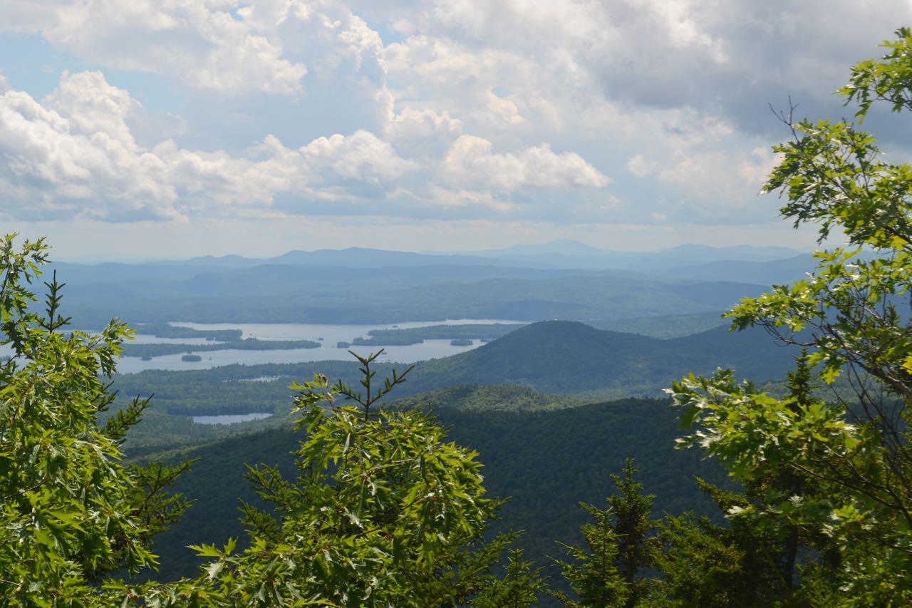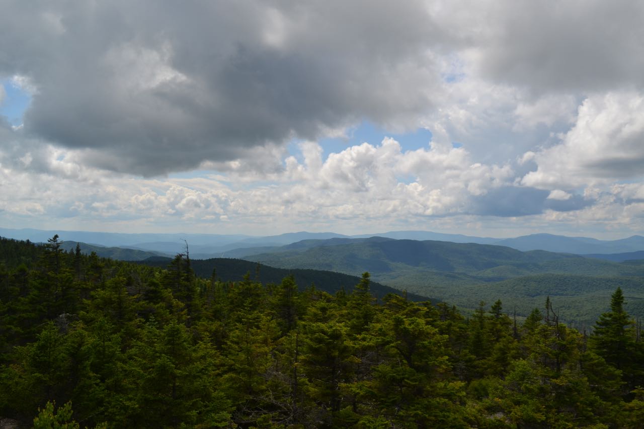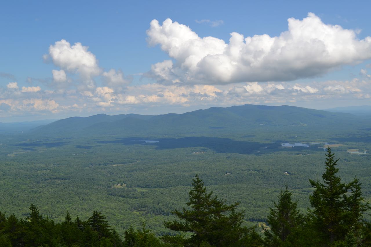 From the tiny dome of the summit, there are excellent views in two directions. To the left are Stinson Mountain, Mt. Carr, Mt. Kineo, and Mt. Cushman, seen over the Campton Range. To the left of Black Mountain, a spur of Sandwich Dome, is Mt. Moosilauke. Massive Sandwich Dome rises across a valley in front of you. To the right of Sandwich Dome are the two sharp peaks of North and South Tripyramid, with the gentler West and East Sleeper on the ridge to Mt. Whiteface. Below are the two Flat Mountains. Behind Mt. Whiteface is Mt. Passaconaway and two of its sub-peaks, Nanamocomuck Peak and Wonalancet Hedgehog, to the right. Further over are the ledgy mound of Mt. Paugus and the sharp pinnacle of Mt. Chocorua. For a better view to the flatlands to the east, step off the northeast side of the summit cone (about opposite where the trail comes up) and follow a herd path down through the forest for less than 0.1 miles to a wide, flat ledge area. A more obscure herd path leads a short distance from here to another ledge on the east side with a good view of the Ossipee Mountains.