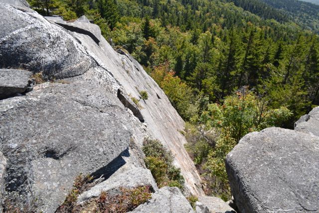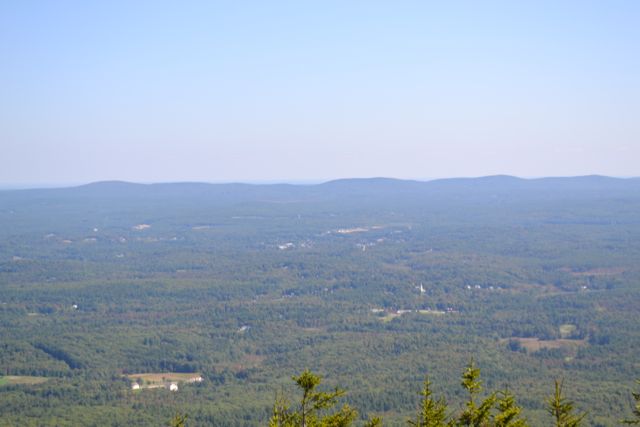 The summit presents a unique view of a very flat area, because of Monadnock's isolation. From the east to the southwest, the terrain around you is fairly level for as far as you can see, with the exception of the small Wapack Range and a few isolated hills, such as Gap Mountain and the Uncanoonucs. To the west, you can see the long ridgeline of the Green Mountains in Vermont. Most prominent are Stratton Mountain, to the west-northwest, and Mt. Ascutney, to the north-northwest. To the north are Croydon Peak and several mountains around Pillsbury State Park, including Lovewell Mountain and Mt. Sunapee. On very clear days, you can see the White Mountains stretching from north to northeast. To the northeast are the Ossipee and Belknap Ranges.