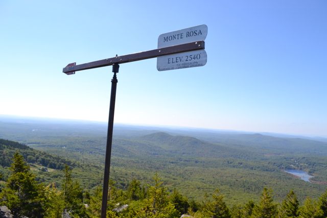 Monte Rosa provides a fine view of the surrounding towns, ponds, and small hills. To continue on the hike, turn right onto Smith-Summit Trail (Great Pasture Trail bears left). The trail descends slightly from this sub-peak before resuming the ascent over open rock. The environment is similar to that of a much taller mountain; this is the result of many forest fires. Pass Smith Bypass on the right in 0.1 miles, near a rock known as "The Tooth". In another 0.2 miles, Amphitheater Trail goes right. For a short side trip, turn right and walk out to Black Precipice, and impressive rock face with a view back to Monte Rosa. Continuing up on the main trail, the view gradually expands, and the trees begin to disappear. It is 0.4 miles to the summit. The trail gets very steep quickly, but only for a short section. Just before reaching the summit, the trail joins Dublin Trail, then White Arrow Trail.
