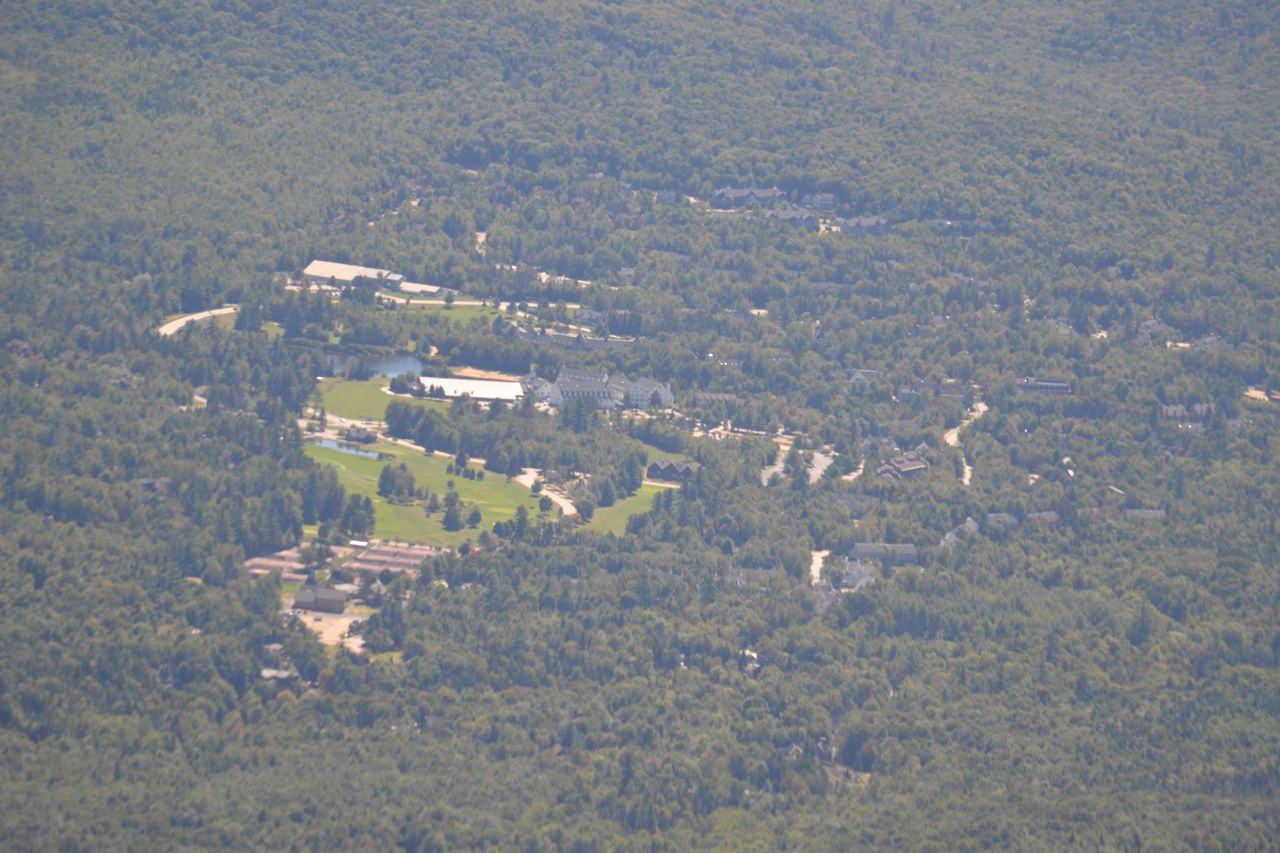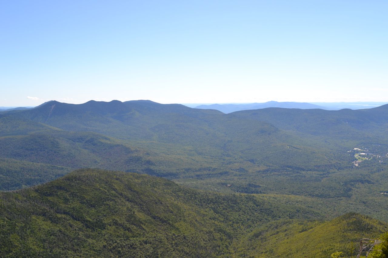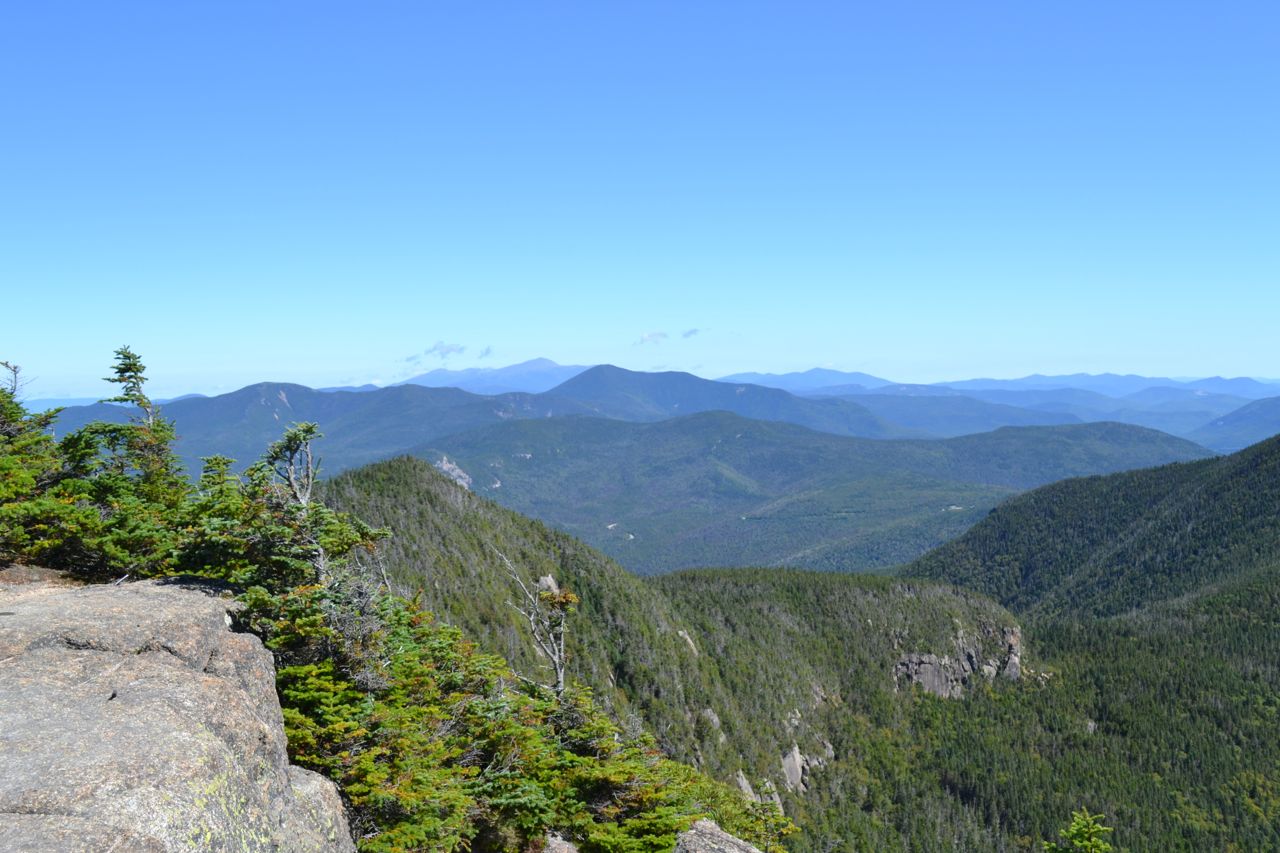 The directional view looks east, directly over Waterville Valley. To the north, you can see Mt. Washington over Mts. Hancock and Carrigain. Further to the east is the Carter-Moriah Range and the smaller ranges near North Conway. Next over, and very close, is East Osceola, with the long ridge of Mt. Kancamagus behind. In the center of the view, over the valley, are the Tripyramids. Continuing over to the south, the Osipees are seen in the distance, with Sandwich Dome closer by and to the south. All the way to the right, you can see the ski trails on Mt. Tecumseh. If you're ready for more, extend your journey to the scenic viewpoints on East Osceola.