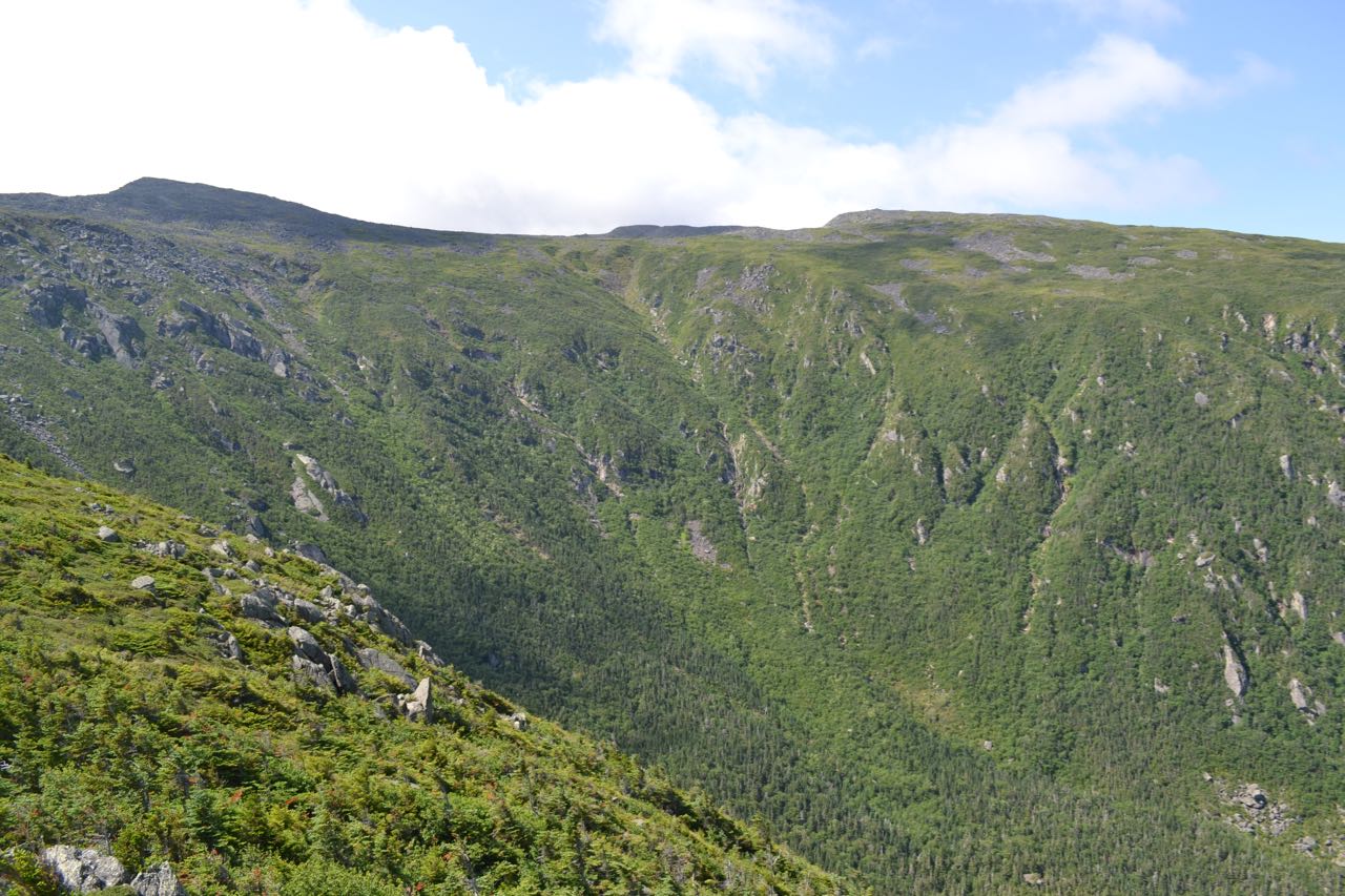 The ascending trail, Air Line, climbs by way of Durand Ridge, a narrow and craggy pathway which rises high above King Ravine. The views from this alpine trail are among the best. To begin your hike, head to the kiosk at the west end of the parking area and follow the trail, crossing the Presidential Range Rail Trail (a gravel bike path) and entering a power line clearing. Bear right onto Air Line. Just after entering the forest, pass The Link on the right, then in 0.2 miles, cross Sylvan Way. Continue at easy grades through the woods for 0.4 more miles, then cross Beechwood Way. Just after this, the trail crosses a seasonal stream. Continue for 0.2 miles, then bear left to stay on Air Line where Short Line continues straight. Here, the trail becomes steeper and climbs 0.1 miles to a junction with Randolph Path, which comes in on the left. The two trails join for a short distance, then Air Line turns left, as do you. The trail now continues for 0.7 miles at mostly easy grades, but becoming steeper, with occasional rough and rocky sections. The forest around you gradually becomes darker and thicker. Then, the trail switchbacks up a steep slope and begins the rocky ascent up the west side of Durand Ridge. For over half a mile, the trail angles steeply up the slope, becoming even rockier the higher it gets. Some sections are quite rough, including a few rock scrambles near the end. After this difficult climb, Air Line levels on a wet, mossy plateau where it meanders for about 0.3 miles before passing Scar Trail on the left. Here, the trail begins to climb again, and continues at moderate (but much easier) grades for 0.6 miles before it leaves the forest and emerges in the alpine zone. After just a short climb in the open, you are greeted with breathtaking views. To your right it is a sheer 1000 feet down to the talus-filled floor of King Ravine. The amazing headwall of this ravine is filled with cliffs, slides, and cascades. Ahead of you on the trail is the section of Durand Ridge known as the "Knife Edge" - not quite as intimidating as Katahdin's ridge of the same name, but still impressive when seen from below. High above are the imposing Adams and Madison, their summits hidden behind shoulders, but still quite impressive. The first views into the distance are to the northeast. Across the valley through which runs Rt. 2 is the low, rolling Crescent Range. Behind and to the left are the more distance Pliny and Pilot Ranges. To the northeast is the city of Berlin; above, the view extends a great distance into the Great North Woods and Maine. Further to the east is the rugged Mahoosuc Range: the summits of Mt. Hayes, Cascade Mountain, Bald Cap, Mt. Success, Mt. Carlo, and Goose Eye Mountain align from lowest to highest; off to the left, the range curves around to Old Speck Mountain, a Maine 4000-footer. Off to Old Speck's left is distant Elephant Mountain, also in Maine.