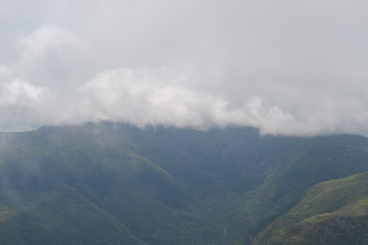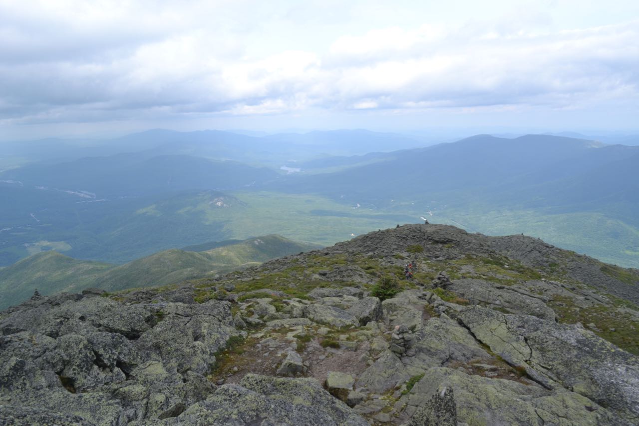 At the summit, dramatic views into the Great Gulf open. Its bowl-shaped headwall is seen under Mt. Washington, across the wilderness. The headwall of the also impressive Jefferson Ravine drops sharply from the ridge between Adams and Jefferson. The deep green of the wilderness contrasts with the pale gray alpine peaks, creating one of the most striking views in the White Mountains. Across the wilderness to the east rises the Carter-Moriah Range. Closest is Wildcat Mountain and its ski area, with various mountains around Kearsarge North behind it. Carter Dome rises across the partially blocked Carter Notch from Wildcat and the ridge leads across Mt. Hight, through Zeta Pass, and up to South and Middle Carter. Mt. Moriah is at the north end of the range, with a few peaks in the Evans Notch region behind it. Then the view swings around to Mt. Madison, with the Mahoosuc Range beyond. To the north, the view remains much the same as you saw it ascending Durand Ridge.