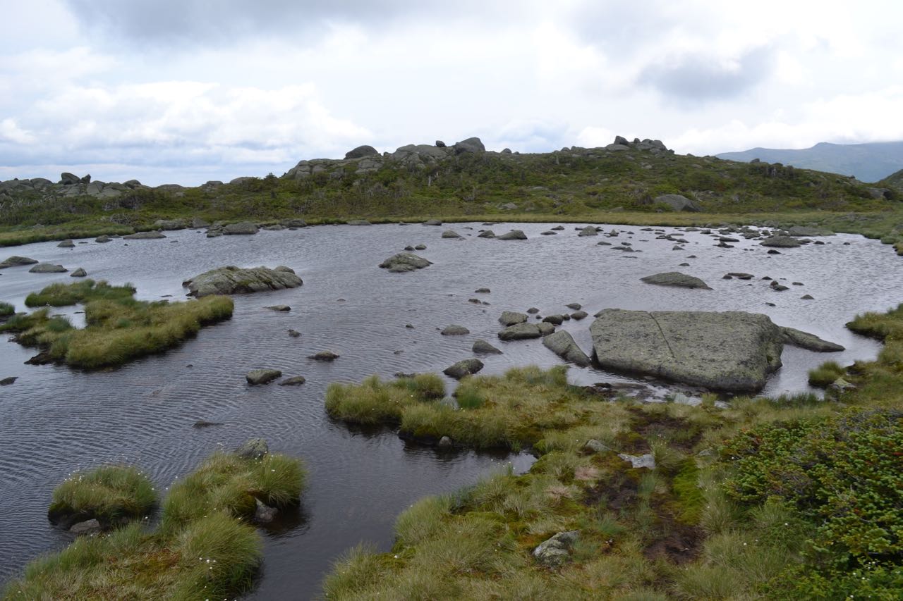 Descend from Mt. Adams the same way you came up until you reach the junction with Gulfside Trail. Turn right, and continue straight onto Gulfside Trail, passing the way you ascended on the left. Descend easily on a well-constructed stone pathway for 0.3 miles with Madison Spring Hut in sight ahead. Reach the hut after going through a small patch of trees and passing Valley Way on the left. For a scenic side trip (included in trip mileage), turn right onto Star Lake Trail and walk an easy 0.2 miles to Star Lake, a picturesque alpine pool under the cliffs of Mt. Quincy Adams, a spur of Mt. Adams. Just before the lake, reach a fork. Turn right for the closest view of the lake. Back at the junction, turn left onto Parapet Trail and stroll by the lake, then in a short distance, turn right onto a path out to the ledge outcrop known as The Parapet. This ledge has fine views over the Great Gulf as well as back over Star Lake and up to Mts. Adams and Madison. Note: you may visit Star Lake without a side trip by following the Star Lake Trail down from the summit of Mt. Adams, but this way is steeper and more difficult to follow. To continue to Mt. Madison, return to the hut and turn right onto Osgood Trail (across from Gulfside Trail; begins along the north side of the hut). Quickly pass Pine Link on the left, then pass through a patch of trees. The climb begins at a steep grade, climbing over boulders and rock slabs, but is still gentler than the final ascent of Adams. Look back for views of Mt. Adams, Star Lake, and Madison Spring Hut. The climb steepens further up, then the trail drops to the south side of the ridge and travels easily just below the crest. Soon it climbs quickly back to the top, then follows the narrow, rocky spine over several bumps to the summit. At the summit, views are excellent. Although the view of the Great Gulf's headwall is now blocked by Mt. Adams, new vistas of several interesting features are gained, including peeks down into Madison Gulf, a better view to the west, a great look down the Howker and Osgood Ridges, and an exceptional view down into the Androscoggin River Valley.