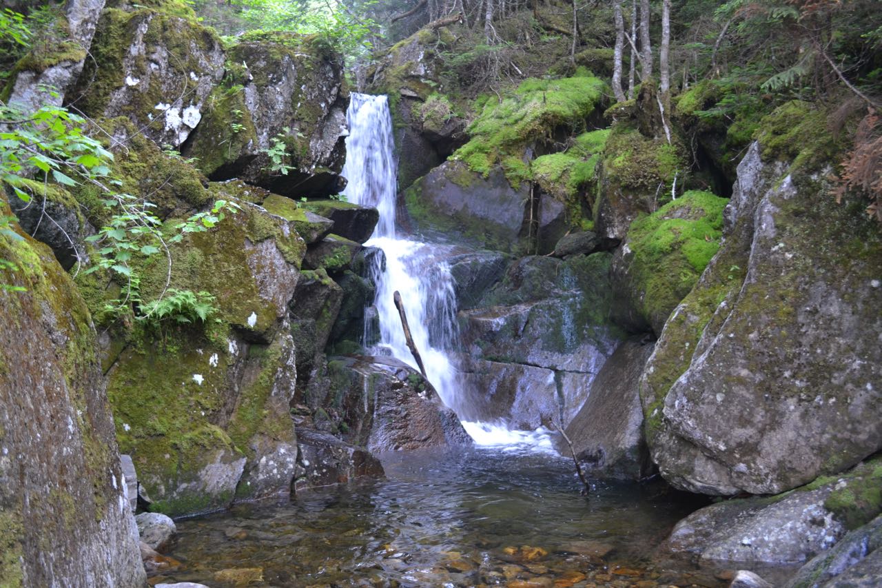 The descent described here begins on Watson Path, a very rugged trail which stays above treeline for 0.7 miles. A far less scenic, but much easier and more sheltered option is to return to Madison Spring Hut and descend on Valley Way for one mile, then turn right onto Lower Bruin and continue 0.2 miles to Watson Path. Then you may follow the bottom half of the route described here. From the summit of Mt. Madison, descend on Watson Path over broken rocks, these more similar to those on Mt. Adams. The northern view will be ahead of you to enjoy for a long way. Watch for cairns very carefully, as they are not obvious on this trail, particularly near the top. It soon passes an overhanging boulder on the left, then continues descending steeply for 0.3 miles over the boulders. The trail then crosses Pine Link in a small plateau. Approaching this crossing, the sections of trail over boulders become mixed with gentler areas through patches of krummholz. This easier descent continues for 0.4 miles before the trail enters the forest. Near the bottom of this section, look across the Snyder Brook Valley for views of Durand Ridge and the Knife Edge. Once below treeline, the trail becomes steeper and remains very rough. After a scramble-filled descent of 0.4 miles through the woods, the trail crosses Snyder Brook just below Duck Fall, a two-tiered plunge over mossy rocks. On the other side of the brook, bear right to stay on Watson Path as Lower Bruin goes left (this is the bottom of the easier descent route suggested above). Scramble up the steep brook bank, then pass a sign marking the unimpressive Bruin Rock. Just past this, bear right onto The Brookside. The descent becomes easier now, with only a few steep sections. Soon you reach Snyder Brook again, soon passing Salmacis Fall, a long and graceful water slide. There are views of this cascade both from above and below. Pass Kelton Trail on the right 0.1 miles beyond. The trail soon pulls away from the brook and descends more gradually through an open forest for 0.9 miles. It then approaches the brook again, crosses to the other side, then proceeds for 0.3 miles to a three-way junction right next to the brook. Cross Snyder Brook for one last time to a junction on the opposite shore. Bear right to stay on Brookside, then bear right again onto Valley Way. Pass Beechwood Way on the left, then after a short walk, bear right onto Fallsway for the last feature of the hike. This less-used loop heads to the brook and passes Tama Fall, a rushing, 40-foot cascade. Pass Brookbank on the right, then briefly join Valley Way. Bear right back onto Fallsway, and pass Salroc Fall. Signs designate Upper and Lower Salroc Fall. Both are fine cascades, although the upper half is much larger and prettier. After a scenic 0.4 mile walk along the brook, pass Maple Walk on the left, then drop down to Gordon Fall, a rocky, two-tiered drop. Continue on Fallsway for 0.2 miles, cross the Presidential Range Rail Trail, and end your hike at the east end of the Appalachia parking area.