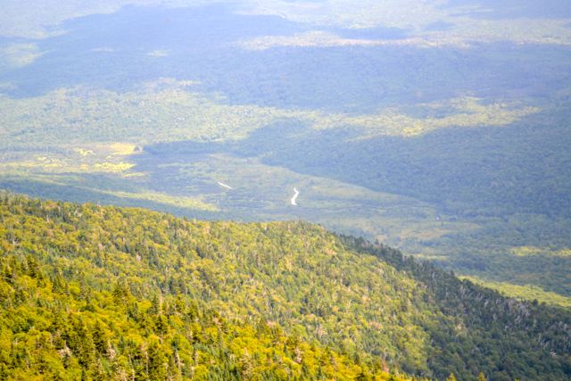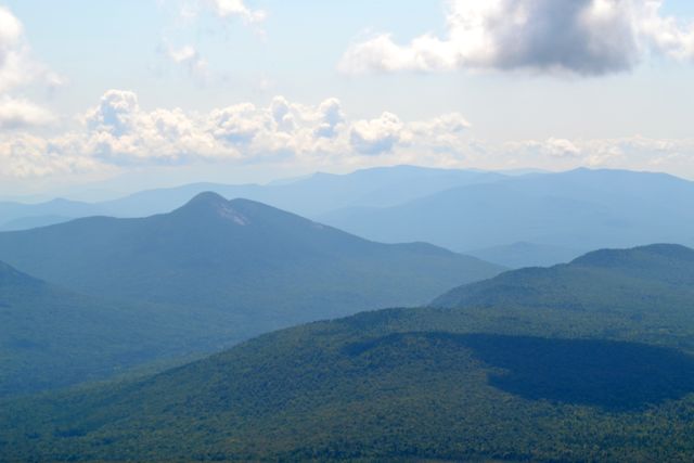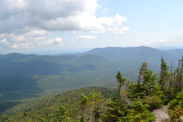 The view from the rocky summit over the vast wilderness is stunning. To the northeast, it looks out over the valley which holds Nash Bog (a former man-made lake) and to Dixville Peak. To the northeast are the two peaks of long Whitcomb Mountain. To the east are the distant northern Mahoosucs, including Maine 4000-footer Old Speck Mountain. To the southeast is nearby Long Mountain, with the smaller Percy Peaks below. Behind the Percy Peaks, to the southeast, is the Kilkenny Range, including Mts. Cabot and Waumbek. To the south and southwest, the view extends for a long distance into the White Mountains. To the west are the nearby Goback and Savage Mountains. From the west to northwest, the view is blocked by trees. To the north, through the trees, are many nearby mountains, including higher Blue Mountain, the tallest mountain north of the Whites.