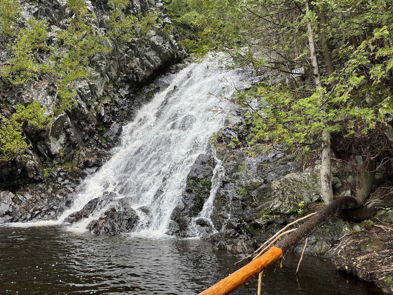About the Hike: The hardest part about getting to the Alpine Cascades is first learning they exist, and then navigating the back streets of Berlin to find them. This unique waterfall, where an indistinct brook careens down a jagged ledge into a nice pool, is frequently visited by ATV'ers exploring the vast off-road network around Berlin-Gorham. Its surroundings are lacking in terms of scenery, being bounded by artificial rip-rap at the edge of an ATV trail through a wide powerline swath, but the clearing does make for a nicely sun-soaked picnic spot with the lovely waterfall in view, and there are picnic tables available.