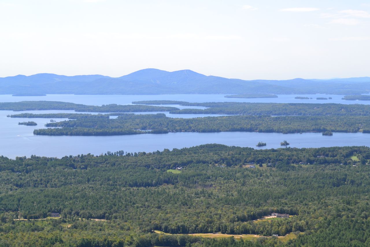When the trail ends in one mile, turn right onto Bald Knob Trail and walk a short distance along a former carriage road to the ledge. From the broad ledge is found a wide vista to the southwest encompassing the area surrounding Lake Winnipesaukee. There is a wooden viewing platform on top, but it is not needed to obtain the gorgeous view. Lake Winnipesaukee occupies a large portion of the landscape, with the Belknap Range in the background. To the right, on a small hill nearby, you can see the Castle in the Clouds. Red Hill is also seen to the right, in the distance.