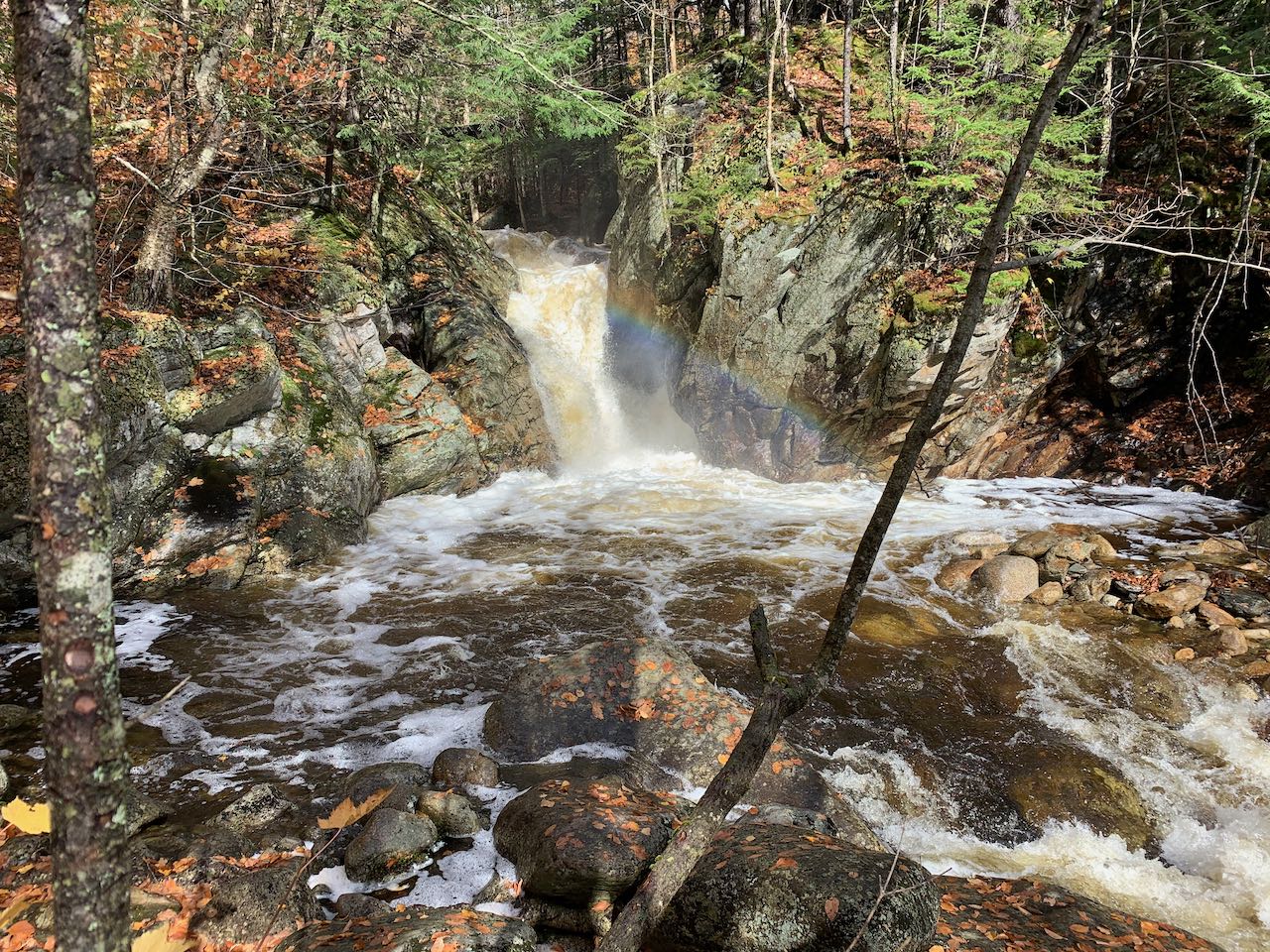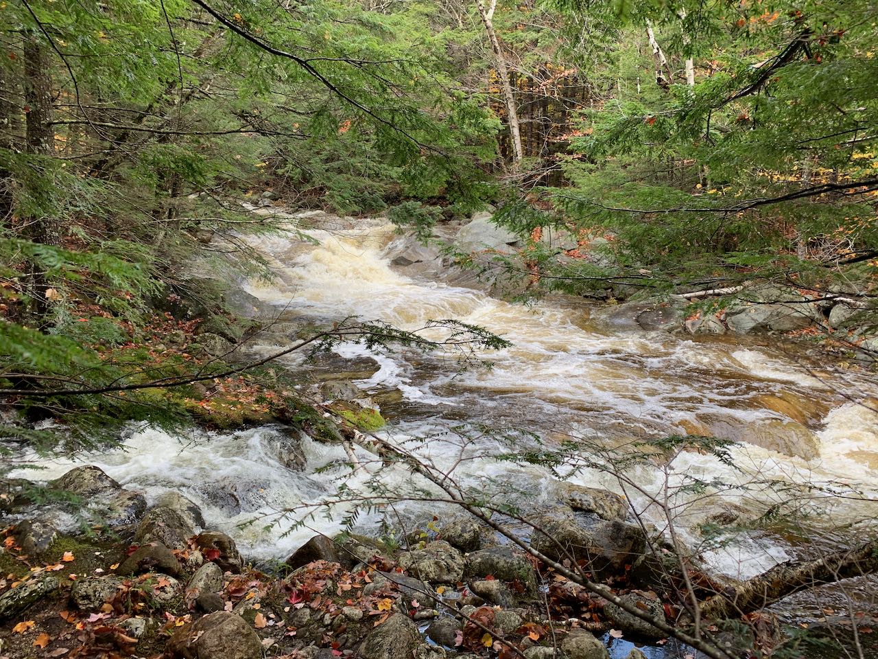 From the parking area, start walking up the gated woods road, which soon approaches Pond Brook, a wide and voluminous waterway. After 0.2 miles, pass a bridge on a privately owned road crossing the river on the right. Several places along the way are close enough to walk out to the brook and see a number of cascades, which are powerful in heavy water flow. In another 0.3 miles, make a right fork onto Bennett Street Trail. This narrower forest path dips down to cross a little brook, then runs mostly level through open woods for 0.35 miles to cross a slightly larger brook. Wandering into darker spruce woods, reach an intersection with Gleason Trail after 0.2 miles more. Bear right and stay on Bennett Street Trail, which soon approaches and runs along the top of the rounded bank above Pond Brook. In just over 0.1 miles, it passes a low cascade and pool and crosses another brook just above where it empties into Pond Brook. The trail continues to stay relatively close by the brook, and in another 0.15 miles, comes near a broad cascade into a sizeable, stone-rimmed pool. The trail then swings uphill away from the brook for a bit and descends to rejoin it, reaching the base of Great Falls after a quarter mile. Here you have a view upstream through the narrow channel in the angled rock walls which constrain the full force of the brook into Great Falls. Though lacking in height, the power of the falls is inspiring. Two large pools swirl below the falls, with a small cascade in between them. Just ahead on the trail, you can walk around to the top of the falls and look down into the miniature gorge.