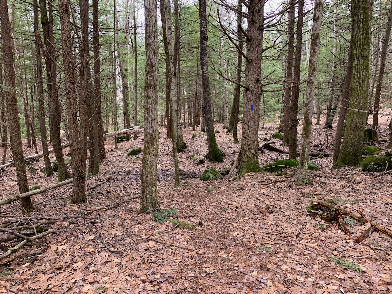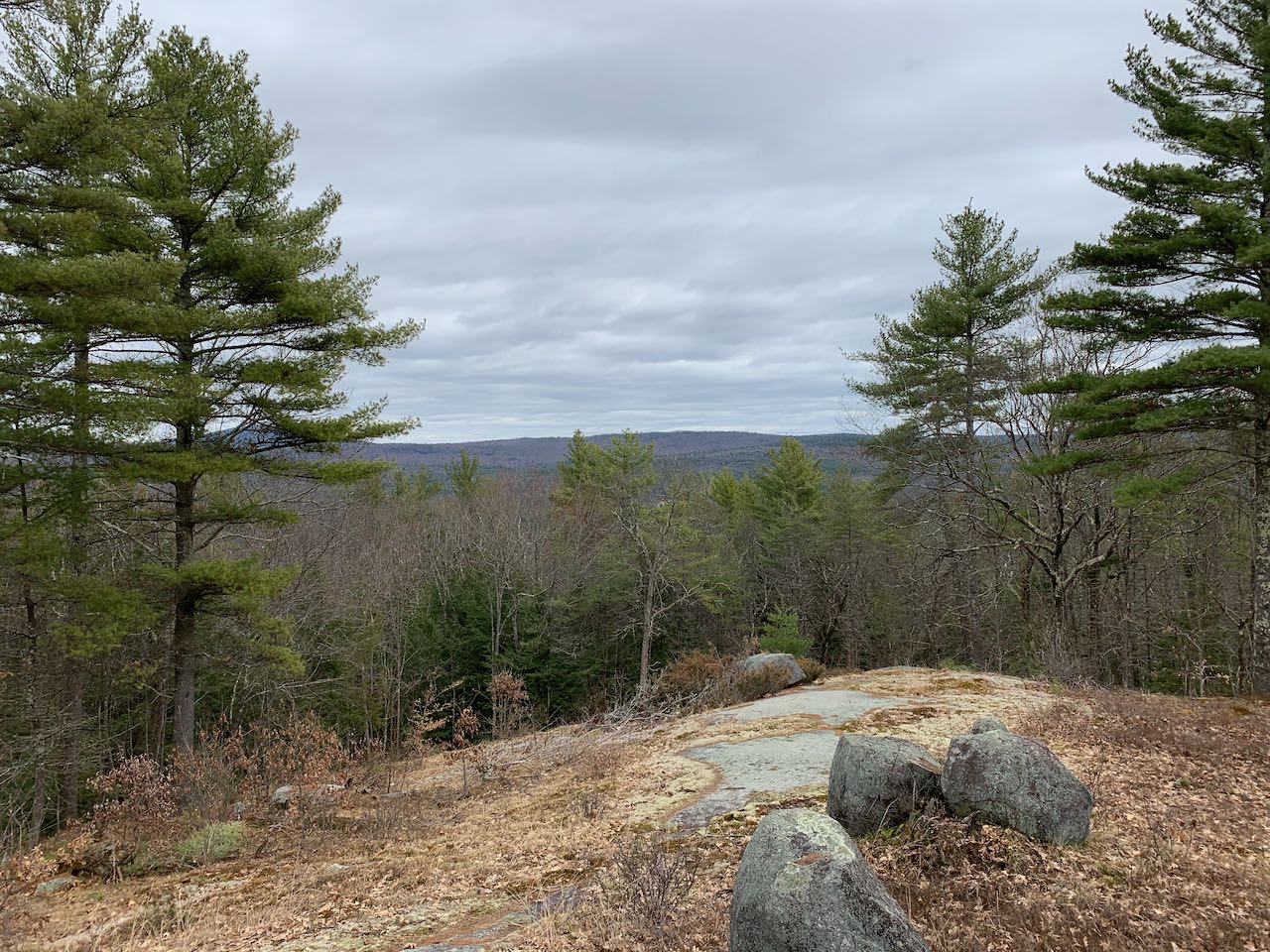About the Hike: This small round hill rises on the east side of Swanzey Lake, a recreational hub in a quiet and charming Monadnock Region town. Partially enclosed with town conservation property, Honey Hill attracts visitors with an easy mile and a half hiking trail leading to a summit with a nice view of Mt. Monadnock from a wide open clearing. It's an out-of-the-way place and offers a pleasant stroll through the woods in addition to the view. From the parking, walk uphill along the left edge of the lawn and bear left into the woods partway up at a sign. Follow the blue blazes uphill along a wide old road. The hike is uneventful for the first half mile as you follow the path underneath a dark hemlock canopy. As it reaches its height-of-land on the northern peak of Honey Hill, it veers left off of the old road and passes a sign indicating that you are now on private property, open to public recreation. It descends quite gradually, crossing one little seasonal stream, reaching a low point at the base of the main summit of Honey Hill after 0.4 miles. Just 0.1 miles, a sign indicates where the blue and yellow trails split. Bear left to stay on the blue trail, which is more direct and generally easier. The trail cuts across the slope, rising gradually for 0.2 miles, then makes a sharp switchback to the left. Climbing a bit more, it makes one more switchback and rejoins the yellow trail after another 0.1 miles. The trail makes another switchback, then meanders across a patchwork of bedrock until it arrives in the clearing on top of the hill after another 0.1 miles. The opening is filled with grasses and mosses, and a single wooden bench is perched in front of the best view. There are openings on all sides where you can peek through the trees, but the clearest view is to the east, where Mt. Monadnock is the only feature rising above the flat landscape.