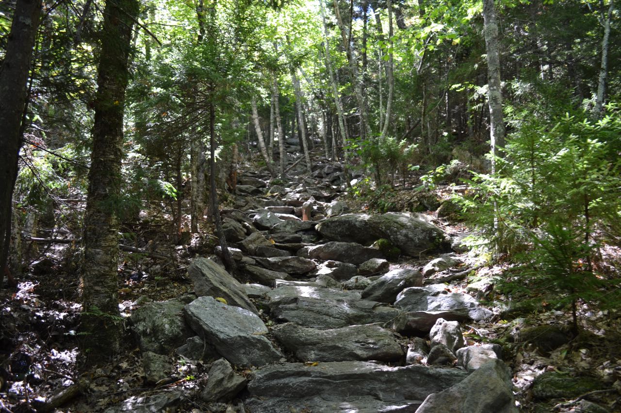 From the trailhead, begin hiking on the Pumpelly Trail. The trail follows a wide path past some signs and through a clearing behind a house, then turns right as the wide path continues ahead. In a short distance, it swings left onto an old road and begins a gradual ascent of Oak Hill. The path soon becomes rocky and passes near the summit of Oak Hill in 0.7 miles. It then descends slightly and continues at easy grades up and down through the pleasant forest for the next mile, until the trail abruptly reaches a stone staircase. It immediately begins a steep, rocky climb. It eventually moderates and reaches open rock in half a mile. Walking is easy over the rock, and there are limited views. After crossing some ledges with good views, it drops back into the forest and ascends over rugged terrain to the next open area, where you can look back down the ridge. The trail continues over intermittent ledges to a trail junction with Cascade Link (bear right), 0.8 miles from the first ledges. Continuing on Pumpelly Trail, it passes through more open ledges with good views west into Vermont and ahead up the ridge to the summit. The trail ascends along the side of the ridge, then swings toward the ridge top and passes the summit of Town Line Peak on the left in another 0.4 miles. Scramble up to the small pinnacle for good views in all directions. The trail descends easily, and in 0.2 miles, passes Spellman Trail on the left in a small col. Just beyond, it passes within sight (through the trees) of a marsh. The trail then climbs to wide open ledges and passes a rectangular rock named "The Sarcophagus", then goes by the first of several alpine bogs. In 0.3 miles from the last junction, pass Red Spot Trail. The trail now dips sharply back into the forest for the last time, then climbs a very steep ledge and ascends completely in the open, following large cairns and passing more alpine bogs. The summit is reached in 0.4 miles. Approaching the summit, cairns (and an obvious route) disappear. Note: to locate the trail when you're ready to leave, look for the "Pumpelly" sign painted on a rock.