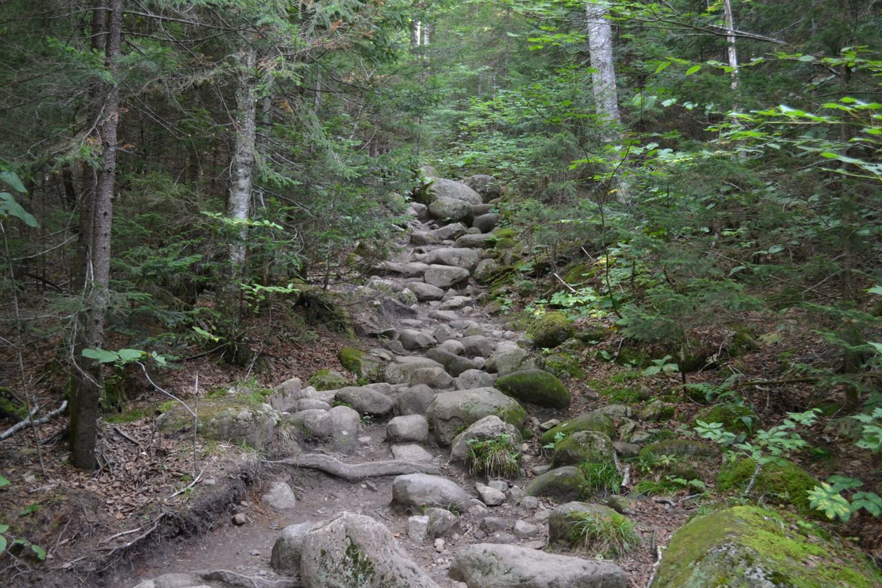 About the Hike: Mt. Pierce, formerly known as Mt. Clinton, is a peak in the Southern Presidentials which is considered one of the easiest 4000-footers to climb. From a small alpine area near its summit, there is a magnificent directional view looking up the ridge of the Southern Presidentials to Mt. Washington. It is reached via the Crawford Path, which, originally created in 1819, is the oldest maintained hiking trail in the country. From the far end of the parking area, follow Crawford Connecter into the woods and soon cross Mt. Clinton Road. The trail begins to ascend on the other side, climbing to a wooden bridge over Gibbs Brook. Pass Crawford Cliff Spur on the left just before the bridge and turn left onto Crawford Path just after it. The trail now joins the brook and climbs more steeply alongside it; in 0.2 miles, a spur leads down to Gibbs Falls, a narrow, angled waterfall. At its base is a wide and shallow pool. The trail continues to climb moderately up the mountainside over rocky terrain for a mile before the environment changes. Then, the forest around the trail becomes lush and mossy. The trail soon passes Mizpah Cutoff on the right and the grade lessens. After another mile of climbing, the trail becomes gravelly and enters the alpine zone. Trailside views begin to appear, and the trail then reaches the junction with Webster Cliff Trail. Turn right and climb 0.1 miles into the grassy alpine area. The true summit, marked by a cairn, is a short distance further on the trail.
