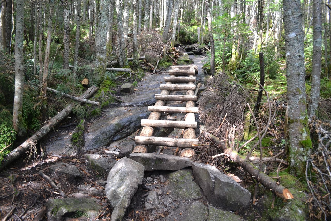 Now the trail traverses a mile-long section of tiring undulations, including several rock scrambles, at the end of which there is no net elevation gain. Toward the end of this section, the trail enters a mossy valley. After it passes two small cascades, the climb begins. Along the ascent there are alternating sections of flat trail and short, steep rock scrambles, many of which are aided by wooden ladders, steps, or footholds cut into the rock. At the end of this 0.8 mile climb, the trail levels out, passes through a bog on bog bridges, and reaches Kinsman Junction in another 0.2 miles. From here, turn left onto Kinsman Pond Trail to make a short and worthwhile side trip past several campsites and a shelter to Kinsman Pond, a lovely lily pad-covered tarn beneath the sheer cliffs of North Kinsman. Relax on a lakeside rock before resuming the ascent. Back at Kinsman Junction, turn left (straight across from where you came up) onto Kinsman Ridge Trail. Now all that remains is a half mile-long rocky climb, easier than the first, but still significantly difficult and involving several difficult rocky sections.