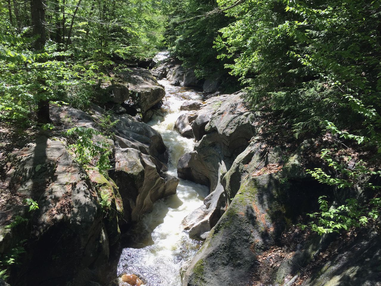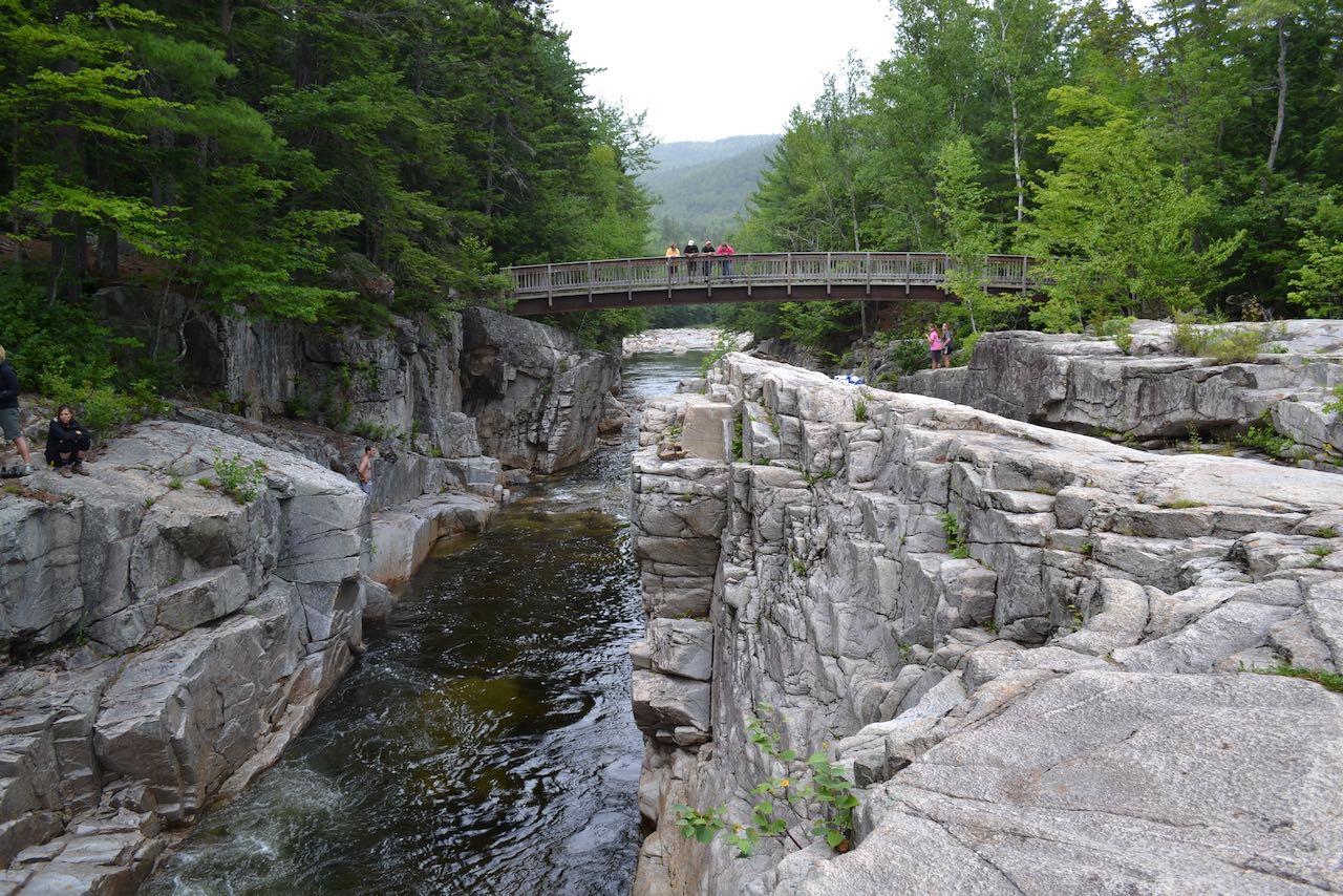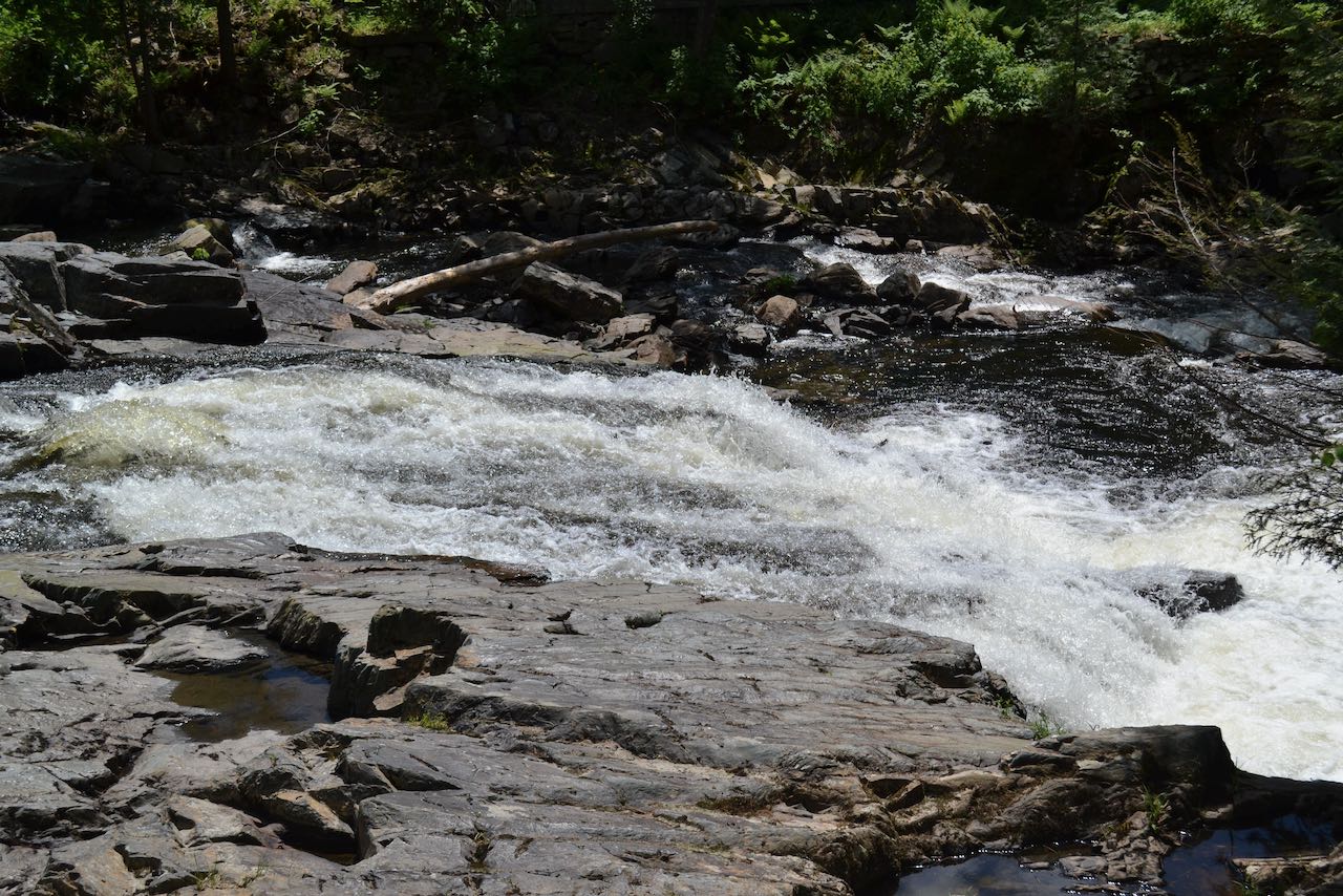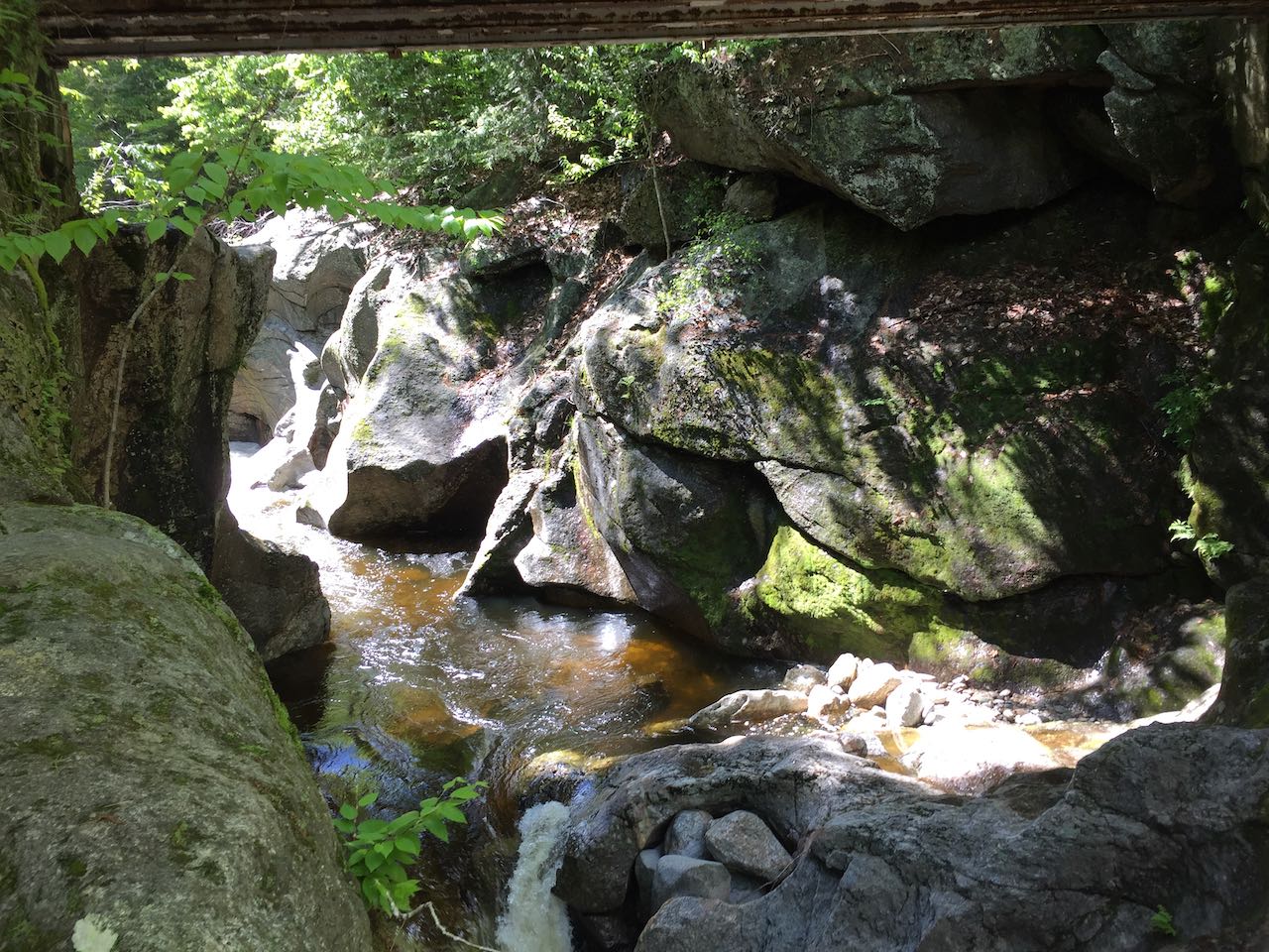 the riverbed formed of entirely ledge make it quite the natural wonder to observe. Closest to the bridge are some low-angle, bubbly rapids where the brook