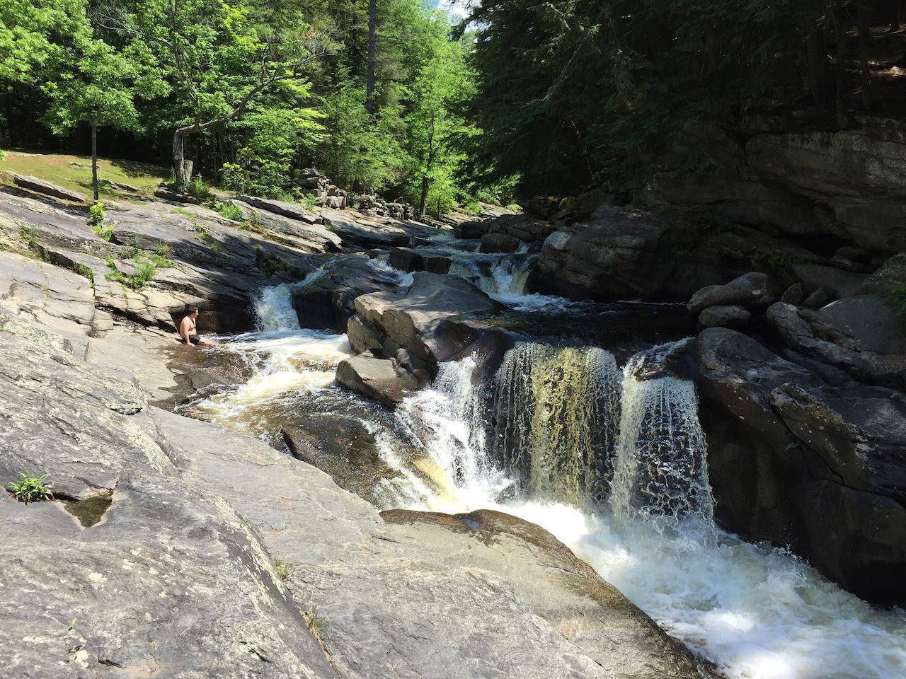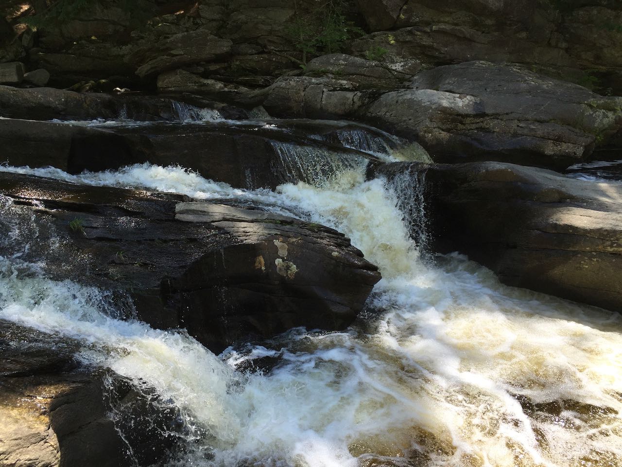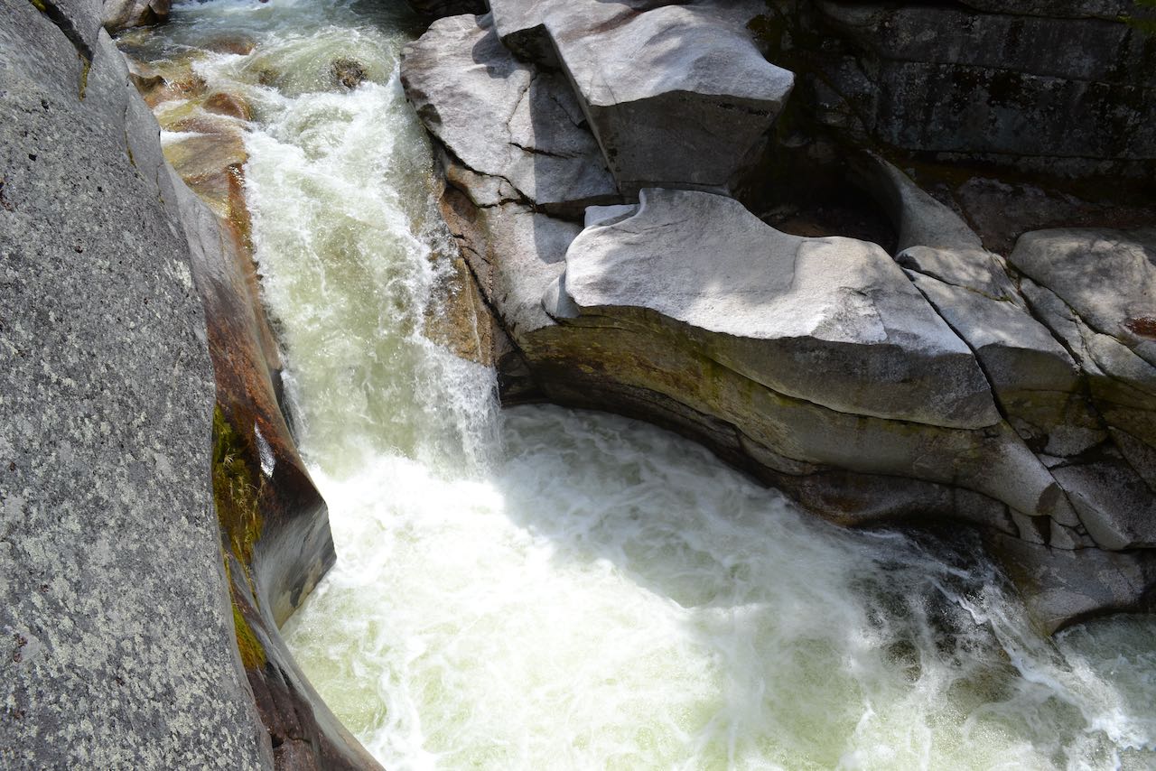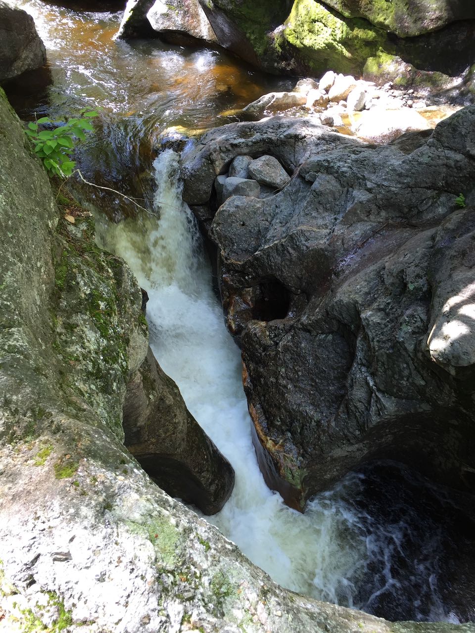 the riverbed formed of entirely ledge make it quite the natural wonder to observe. Closest to the bridge are some low-angle, bubbly rapids where the brook