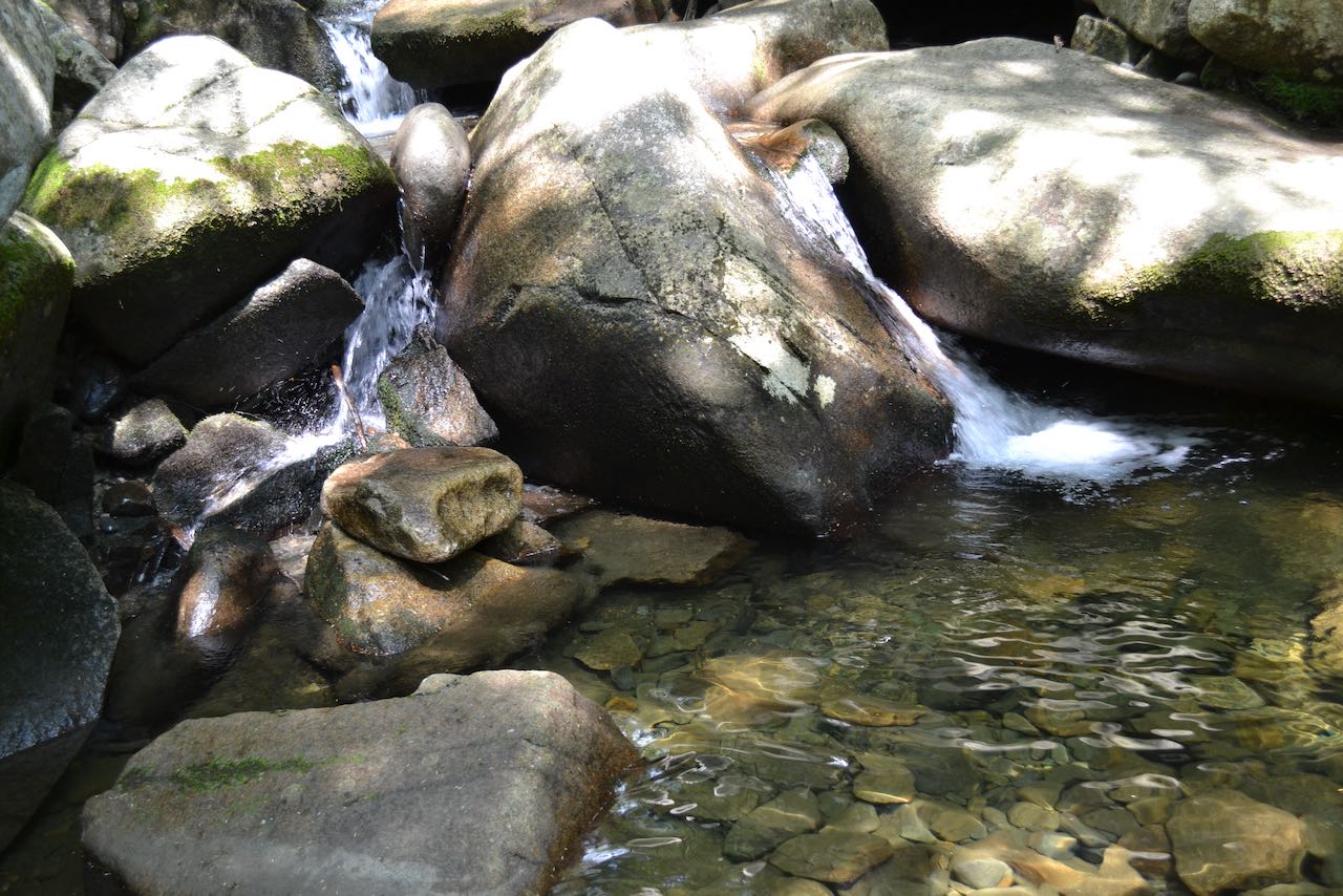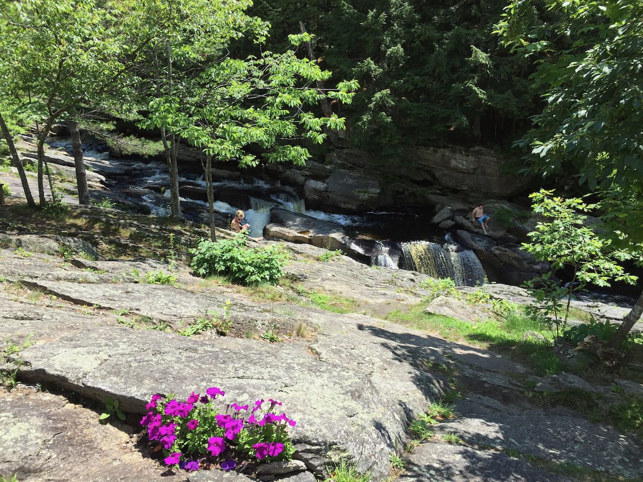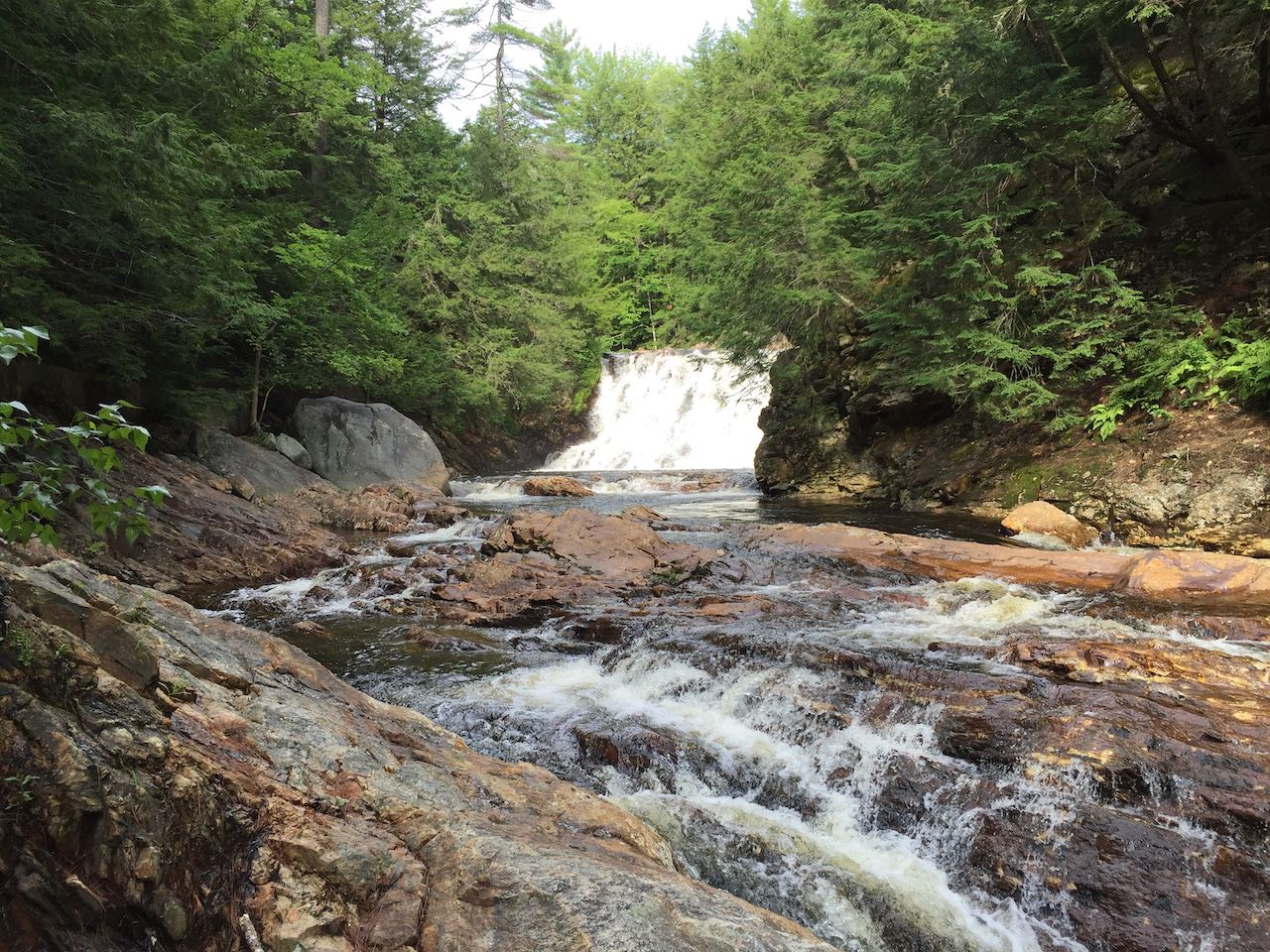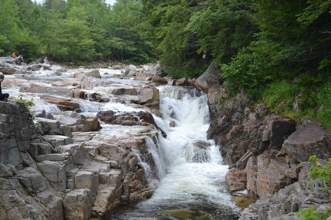 the riverbed formed of entirely ledge make it quite the natural wonder to observe. Closest to the bridge are some low-angle, bubbly rapids where the brook