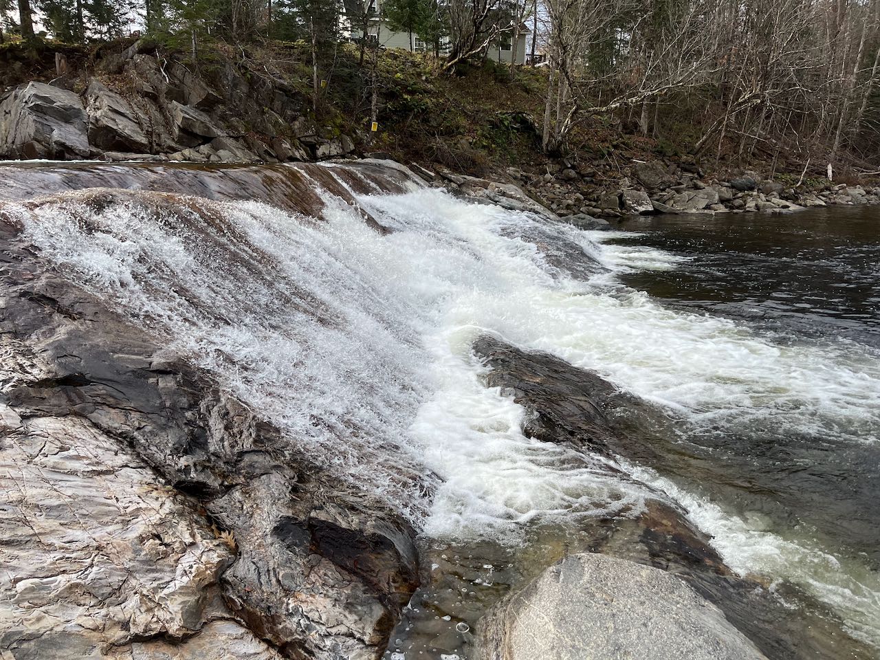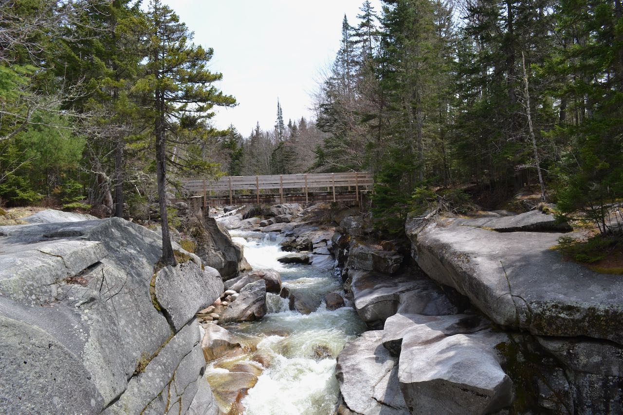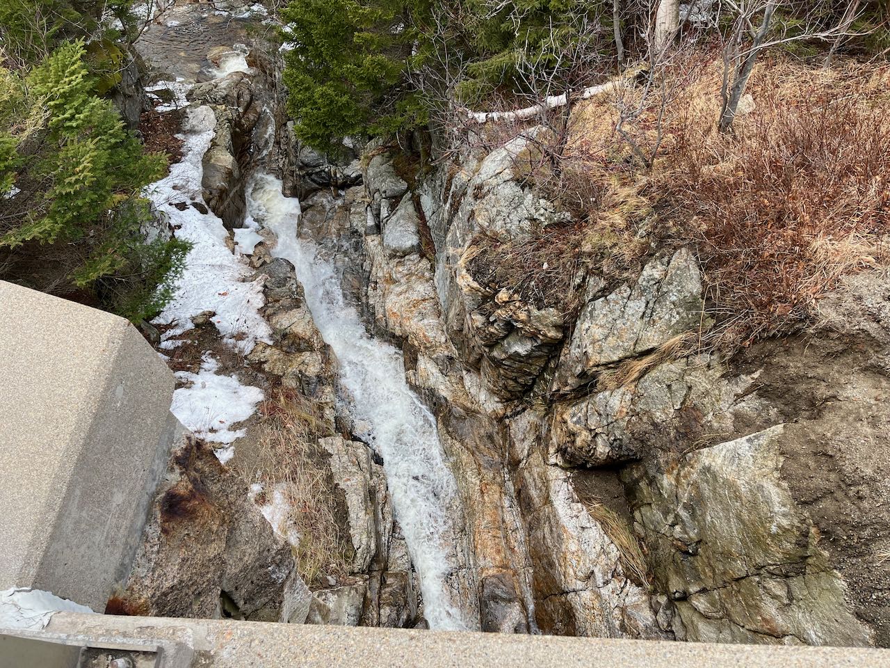 look over the west side of the bridge, you can see the bottom of the cascade flow through a neat sluice to join the Saco River down below.