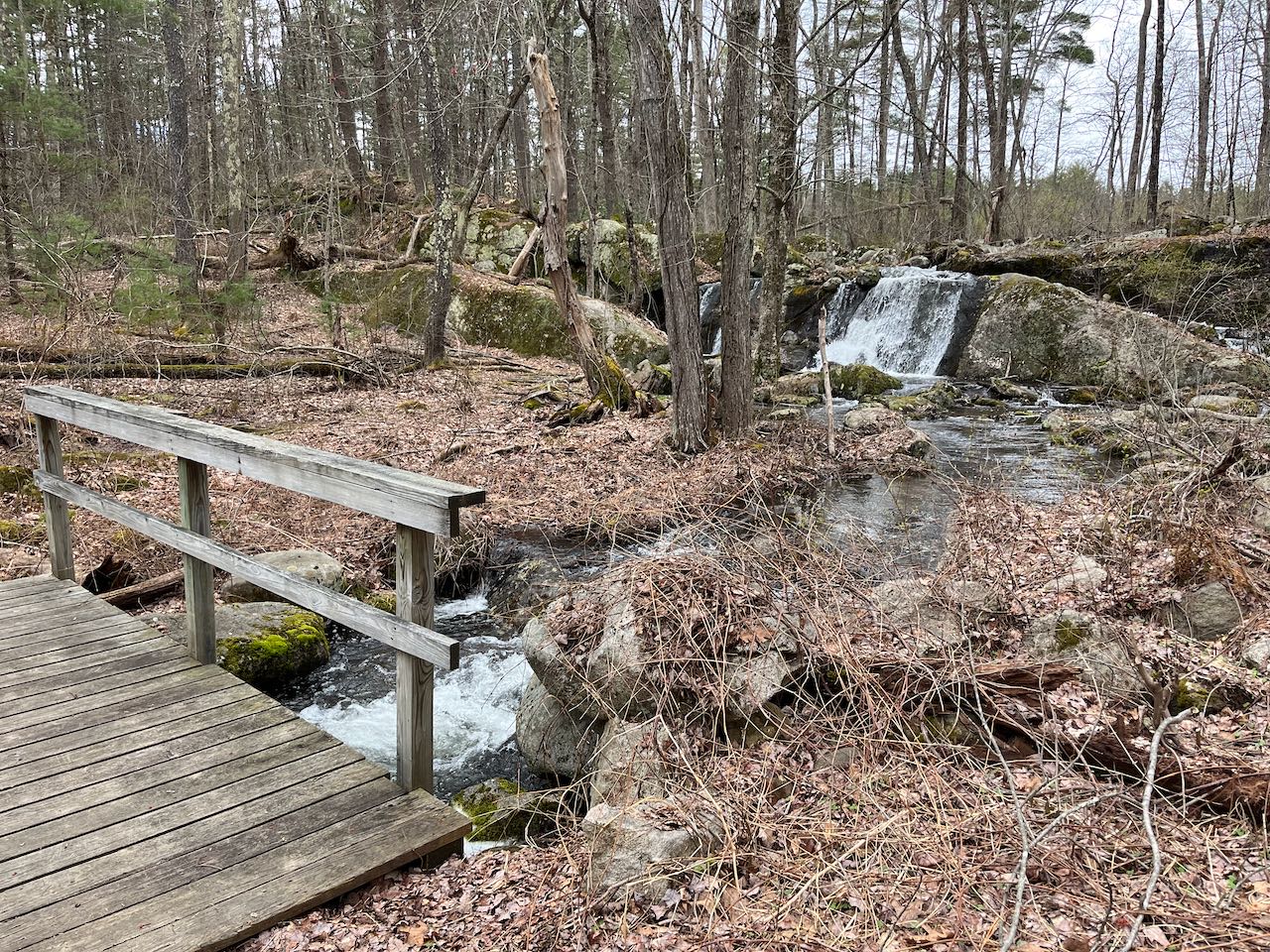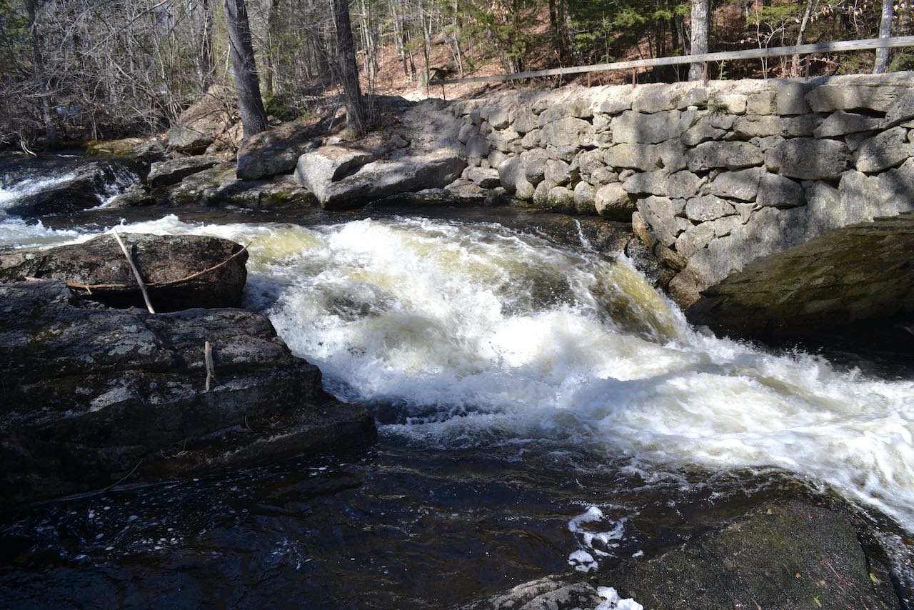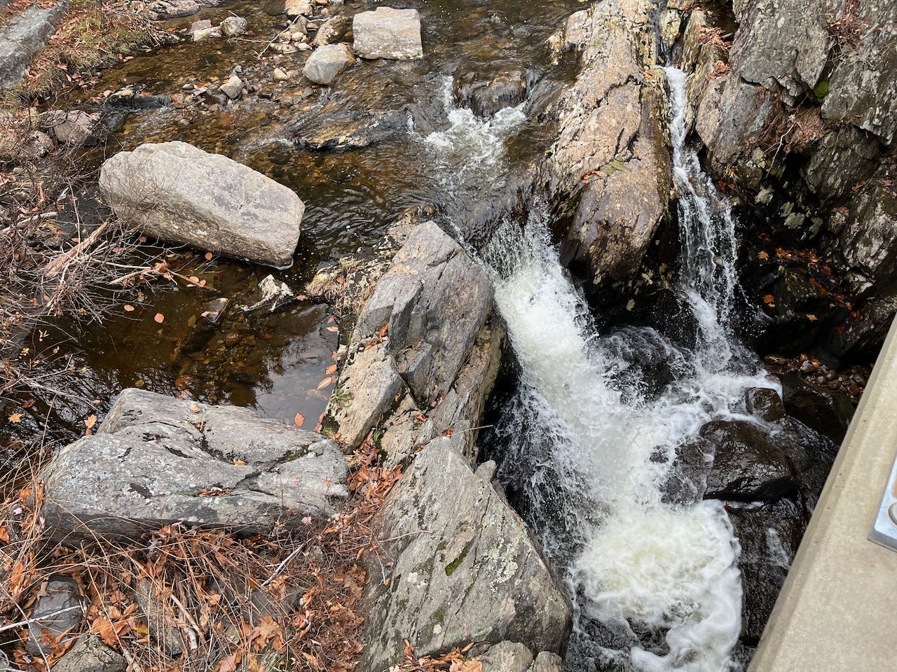 are a wide, 6-foot plunge over a block of ledge, as Rocky Pond Brook exits Worcester Mill Pond.