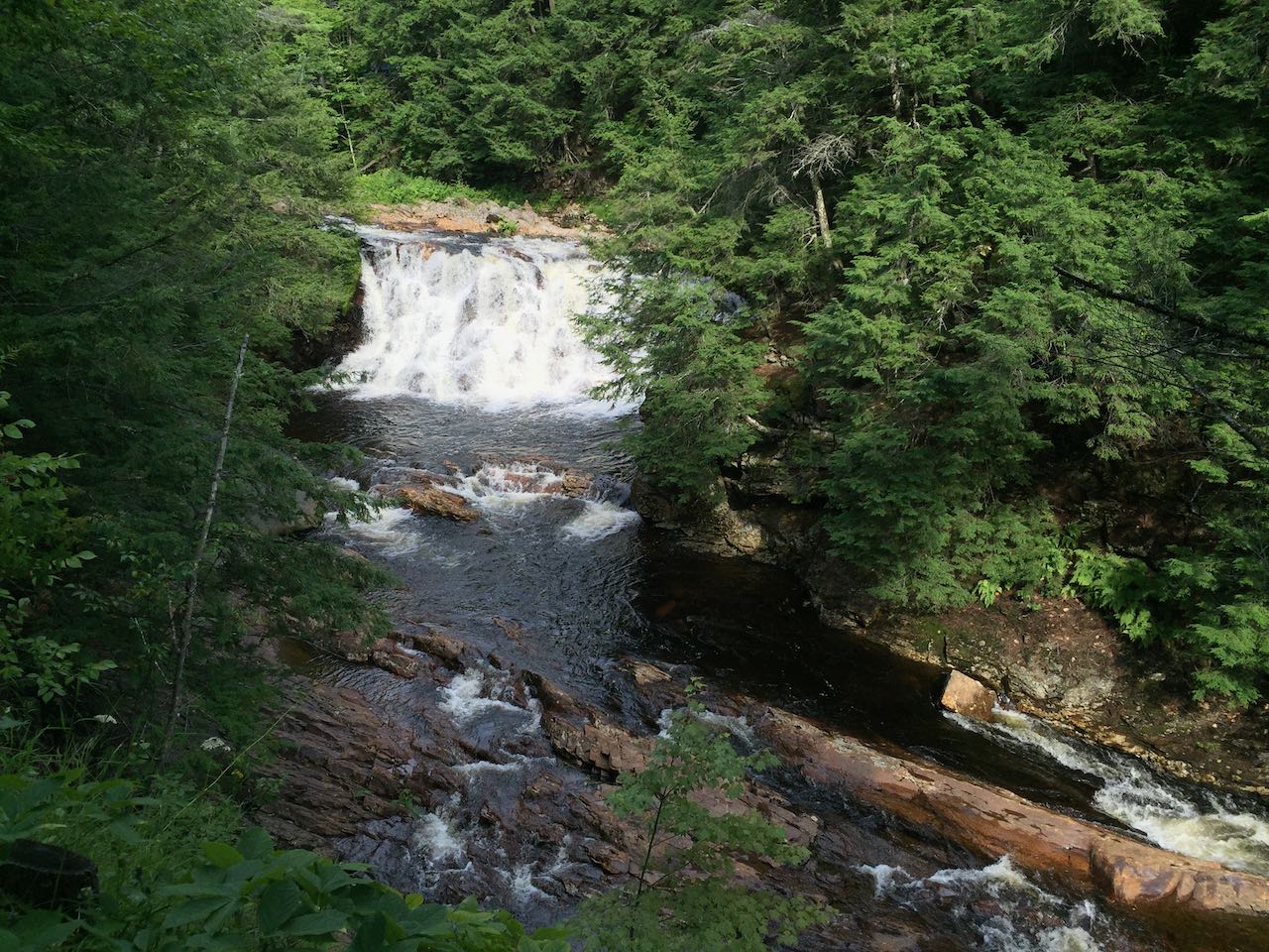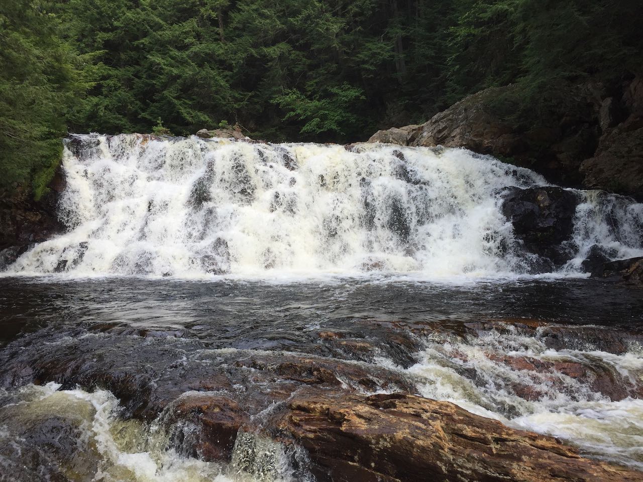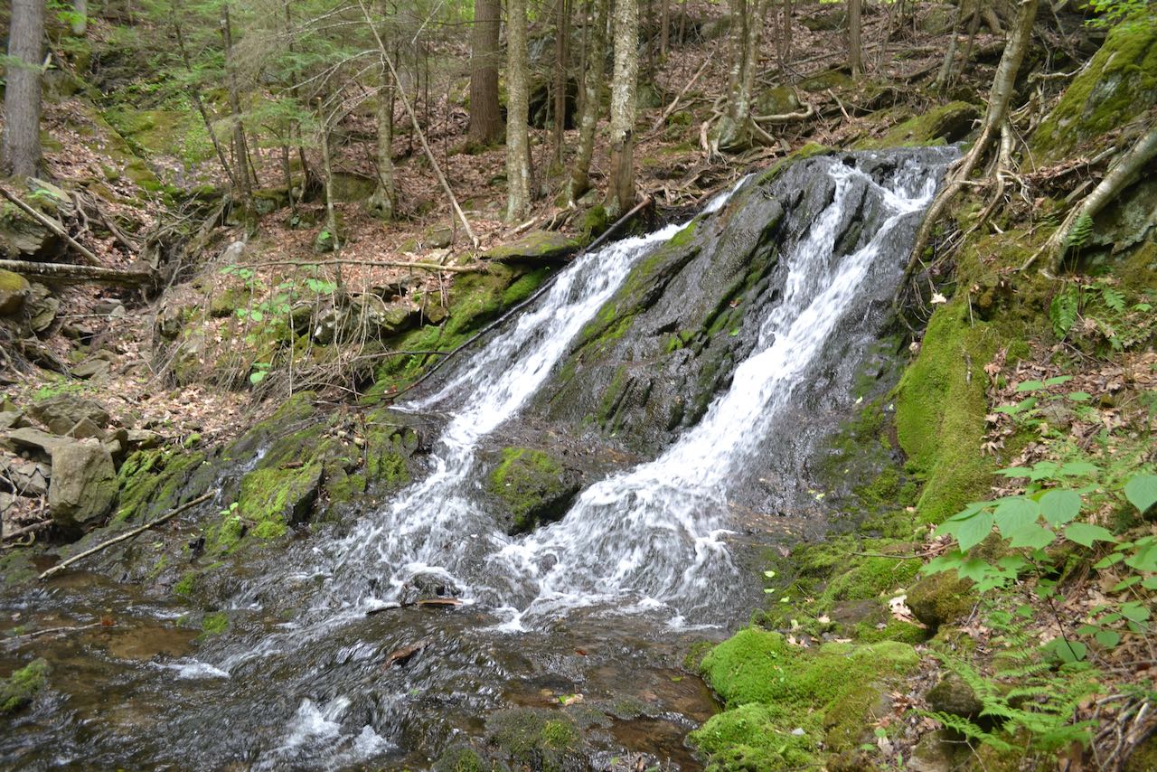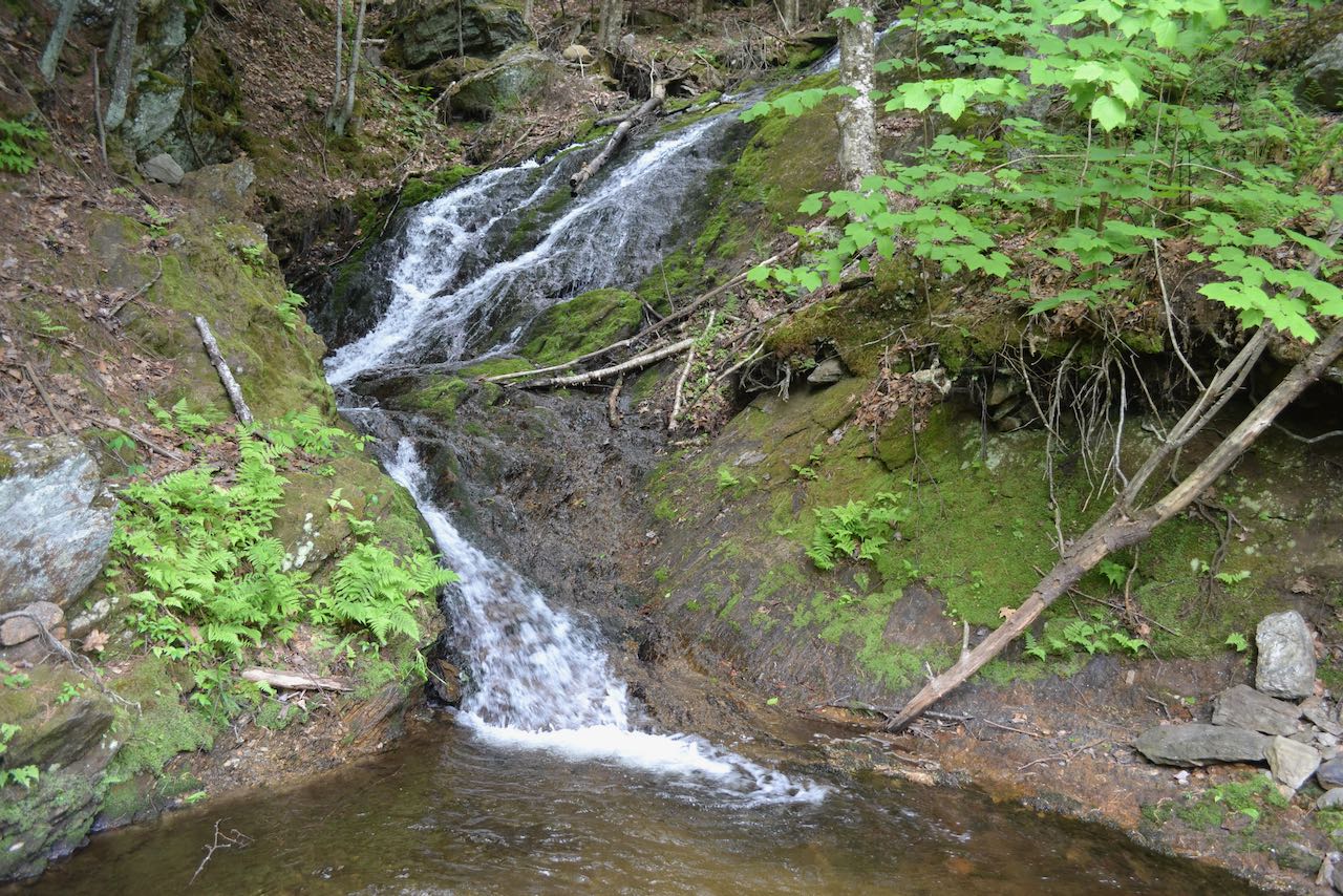 drop. At the highest and shortest drop, the brook plunges over a little ledge into a small pool, then forks and falls over the second drop, where the two