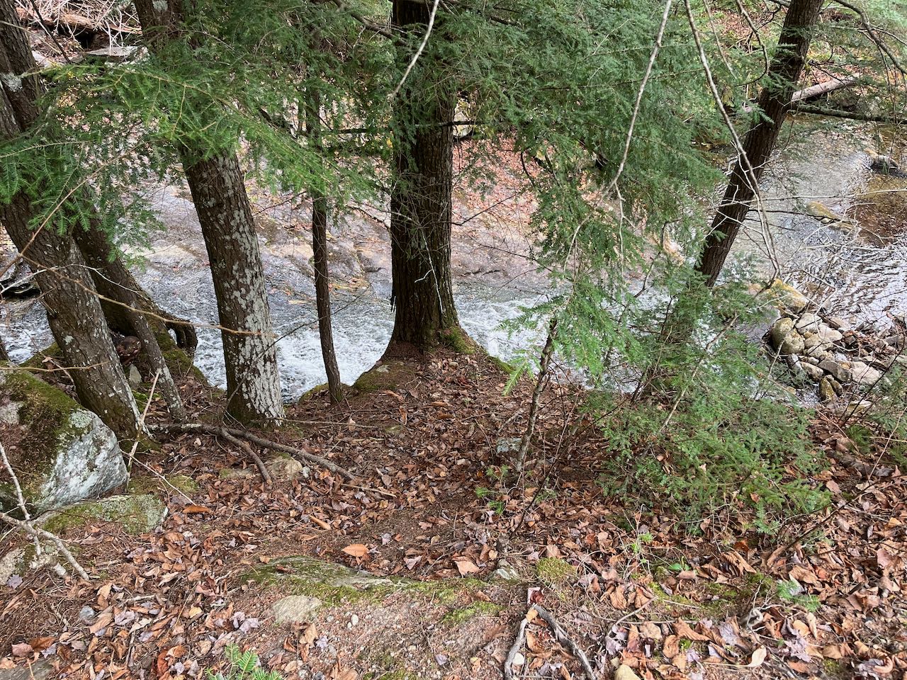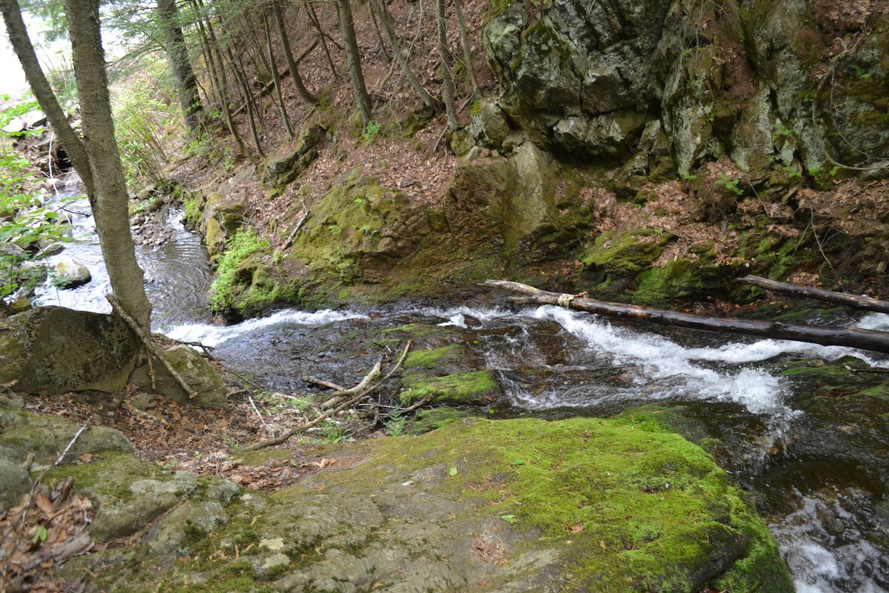 upstream of the bridge, then accelerate underneath and end in a bubbling pool. You can walk down beside the brook underneath the shady hemlocks to get the