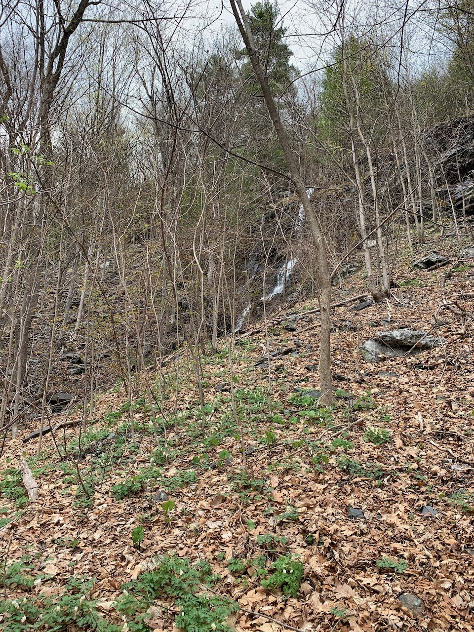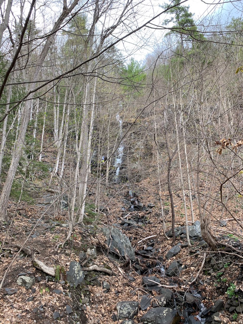 Mountain Trail to the orange gate. From either side of the brook around here, you can look up toward the waterfall. It is a bit set back up the steep slope.