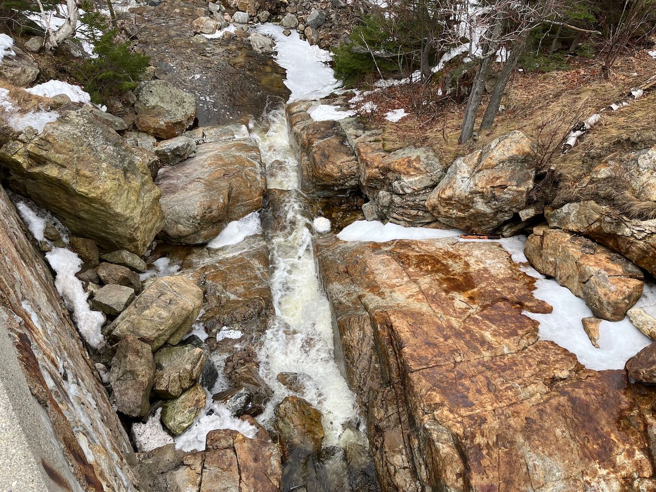 a jumble of boulders on the streambed. The brook slides smoothly down the high-angled ledge into the gorge like a log flume amusement park ride. Below is a