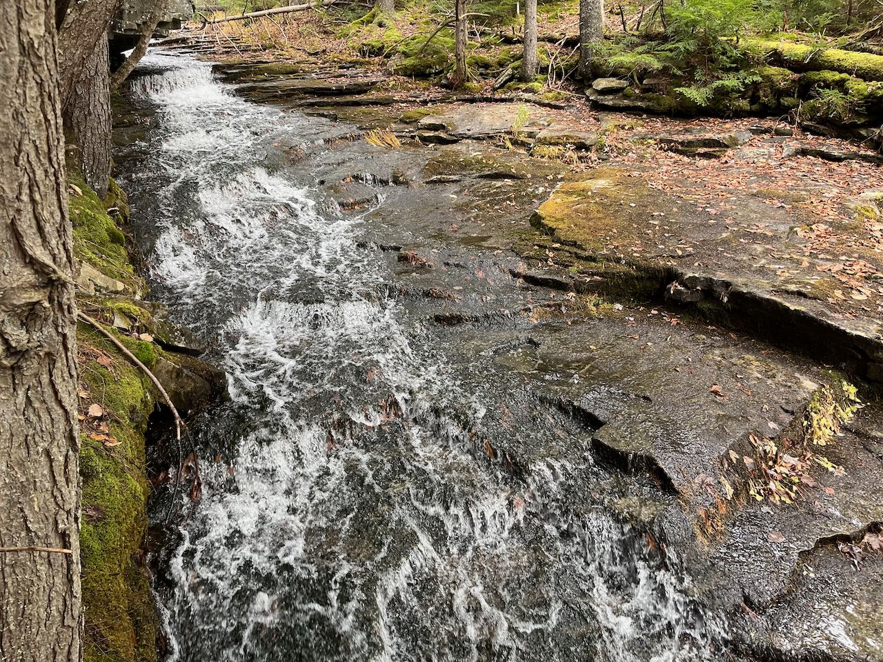 the water fans out and slides down oddly angled ledges. The brook splits up into multiple channels as it flows down through the variety of features.