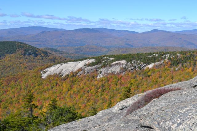 Bayle MountainOssipee Just southeast of the White Mountains, in the Ossipee Range, Bayle Mountain offers a secluded getaway from the crowds. Centrally located inside the circular formation of the range, the low-elevation summit overlooks remote valleys which come alight with fall foliage. Several waterbodies nearby contribute to the gorgeous scenery as well. As an added bonus, the rocky dome, which was burned over in a forest fire, is rife with low-growing vegetation, especially blueberry bushes, which turn a beautiful apple hue in the fall. The hike is brief but intense, with plenty of opportunity for exploration around the mountain's boulder fields and extensive ledges. |