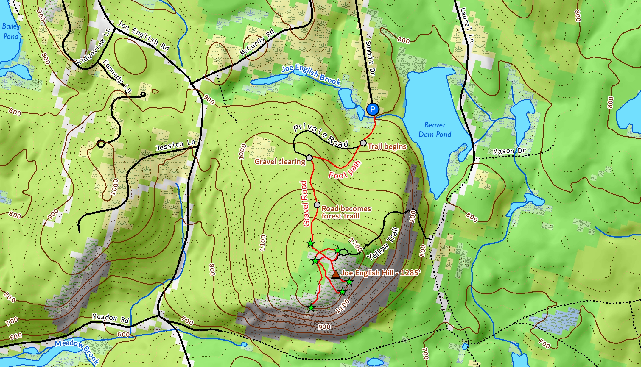Use this trail map with our directions to aid in navigation! The red trails are those included in our description of this hike, and the black trails are other routes you may find in other guides. We have marked any points of interest on our recommended route with gray dots; viewpoints are green stars, summits are brown triangles, and parking is marked with a traditional parking symbol. The background of the map is colored by different environments using data from the NH Wildlife Action Plan by the NH Fish & Game. See the legend to interpret the color scheme. Click on the map to open a blank page with a full-sized version to zoom in or print.
